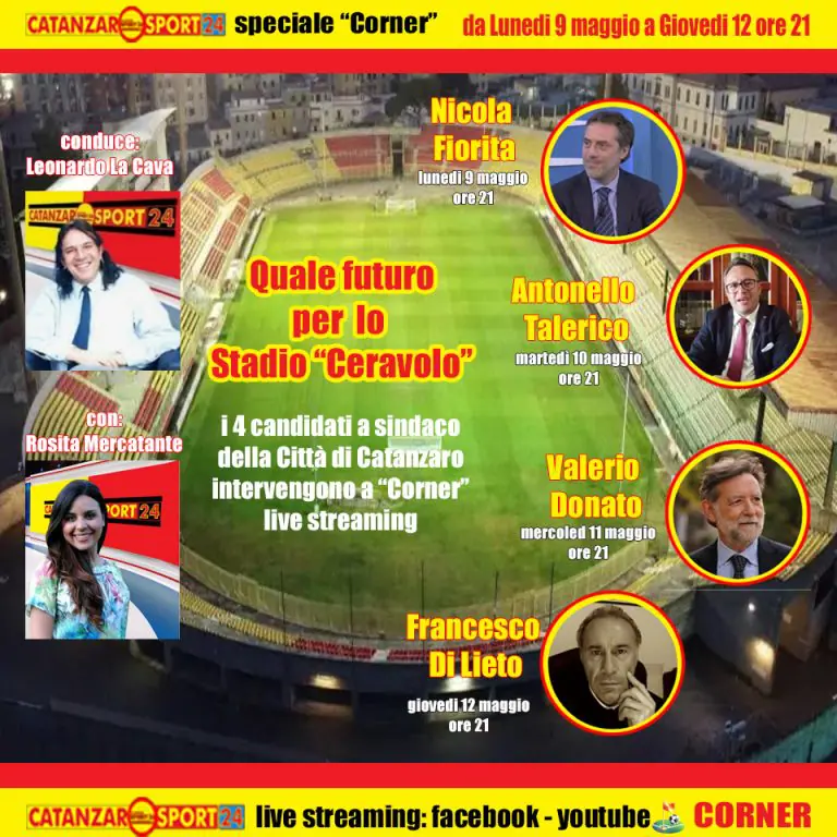 Catanzaro Sport 24: Speciale Corner con i 4 candidati a sindaco: Fiorita, Talerico, Donato e Di Lieto: “Quale futuro per lo stadio Ceravolo” dal 9 al 12 maggio ore 21