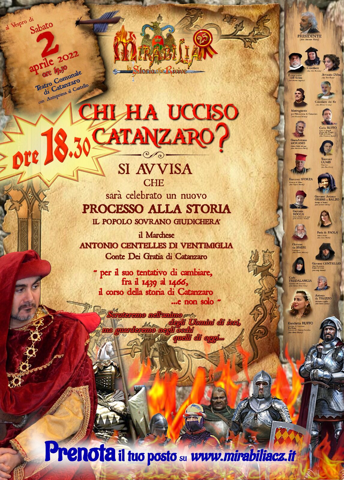 Una città senza memoria è una città senza identità. E’ in questa direzione che l’Associazione Mirabilia, presieduta da Giovanni Matarese, da oltre vent’anni conduce le sue inchieste sulla Storia di Catanzaro: ciò ha inevitabilmente consentito una rilettura critica della storia conosciuta. In tale contesto nascono i cosiddetti “Processi alla Storia”, attraverso cui Mirabilia stimola un nuovo e più diffuso approccio alla conoscenza e all’analisi del nostro passato e del nostro presente. Il processo, questa volta, si terrà al Teatro Comunale di Catanzaro, nel centro del centro storico, domani – sabato 2 aprile – a partire dalle 18.30.