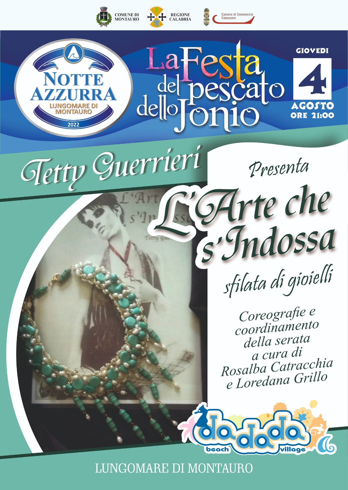 La festa dedicata al pescato dello Jonio è una kermesse ricca di eventi. Da quelli enogastronomici a quelli musicali ma non mancherà anche la moda grazie alla sfilata dedicata ai gioielli di Tetty Guerrieri “L’arte che s’indossa”. L’evento nell’evento è organizzato da Rosalba Catracchia e Loredana Grillo che si occuperanno della sfilata e delle coreografie che presenteranno gli splendidi monili firmati Tetty Guerrieri. L’artista catanzarese riesce a creare dei gioielli unici che per l’occasione avranno come filo conduttore il mare. Perle, pietre preziose, conchiglie e materiali ricercati che assemblati dall’estro e dalla fantasia di Tetty Guerrieri diventano delle opere d’arte da indossare. A rendere ancora più piacevole la sfilata ci sarà il gruppo musicale “Rock and Love music band”.
