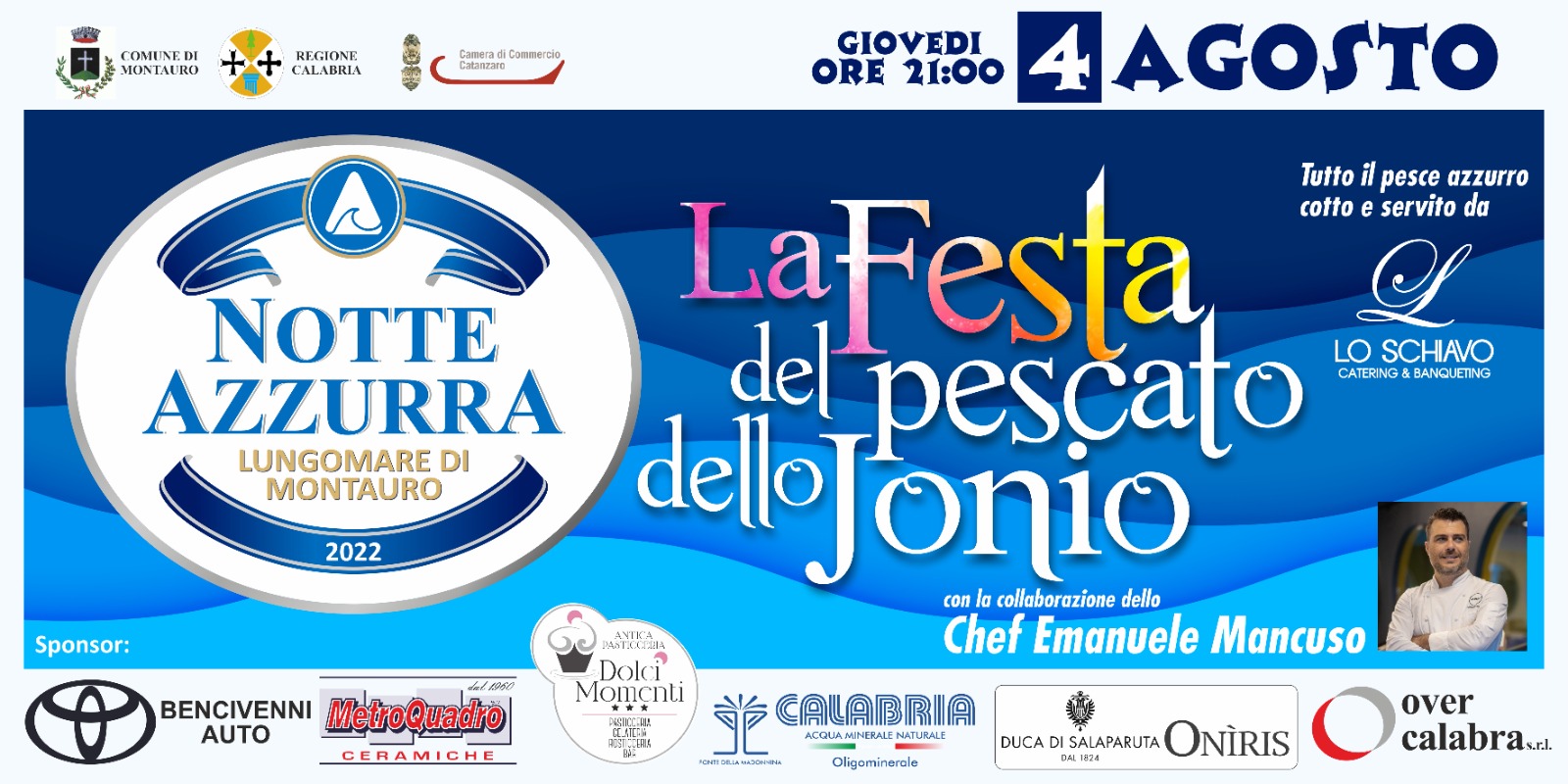 Si terrà il prossimo 4 agosto sul lungomare di Montauro la seconda edizione de “La Notte Azzurra”. Una serata dedicata interamente al pescato del mar Jonio. Dopo il successo dello scorso anno, gli organizzatori hanno deciso di realizzare un evento ancora più bello. La passeggiata a mare della costa dei Saraceni sarà animata da una serie di momenti musicali ed enogastronomici che renderanno unica la “Notte Azzurra” della splendida località marinara della Provincia di Catanzaro. Organizzata con il patrocinio del Comune di Montauro, della Regione Calabria, della Camera di Commercio di Catanzaro e Azzurro di Calabria, la kermesse, sostenuta anche da numerosi sponsor privati, si pone come obiettivo quello di valorizzare i prodotti ittici calabresi e catanzaresi in particolare. Tra stand, aree ristoro e tanta buona musica, la Notte Azzurra sarà l’occasione per passare insieme una serata divertente e allo stesso tempo rilassante.