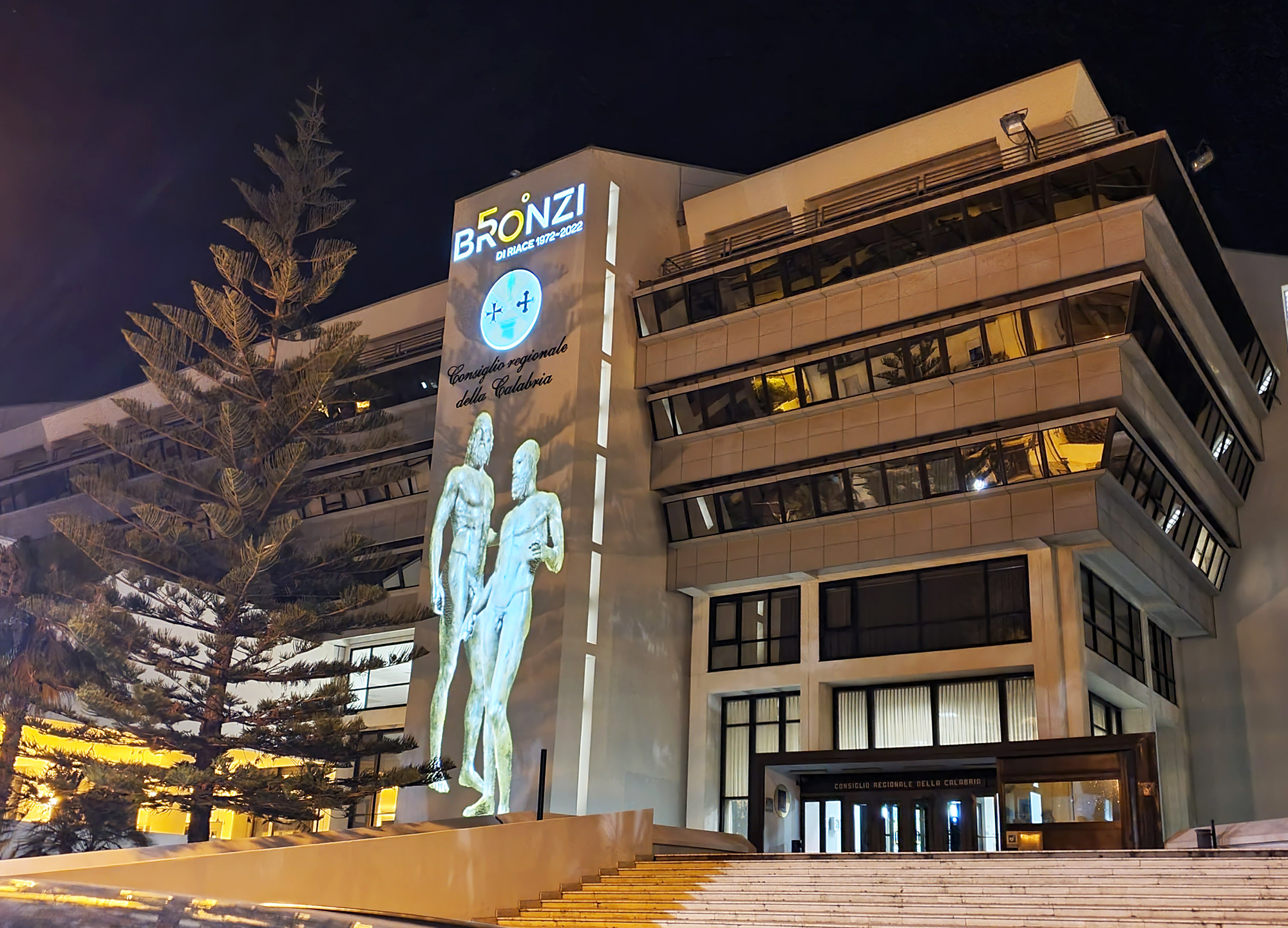 Da sabato sera, l’immagine dei due "magnifici guerrieri" ritrovati il 16 agosto del 1972 è proiettata sulla facciata principale del Consiglio regionale della Calabria. Palazzo Campanella, per l’intero periodo degli eventi celebrativi, ‘ospiterà’ l’ologramma dei Bronzi di Riace e del logo istituzionale del cinquantesimo anniversario del loro ritrovamento.