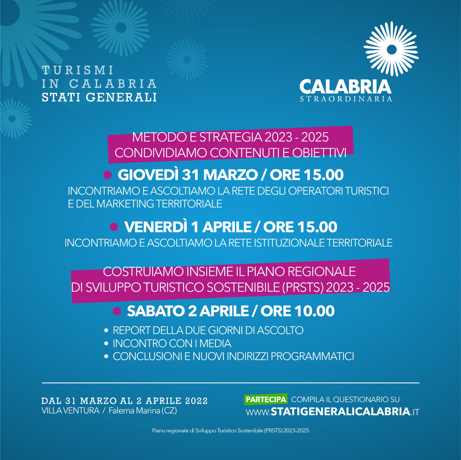 Gli Stati Generali del Turismo si apriranno a Villa Ventura a Falerna Marina (Via della Libertà, 28) giovedì 31 marzo alle ore 15 con gli operatori turistici; proseguiranno venerdì 1 alle ore 15, con la rete istituzionale territoriale; si concluderanno sabato 2 Aprile, con un primo report della due giorni di confronto, la condivisione dei nuovi indirizzi programmatici e l’intervento finale del presidente della Regione Roberto Occhiuto.
