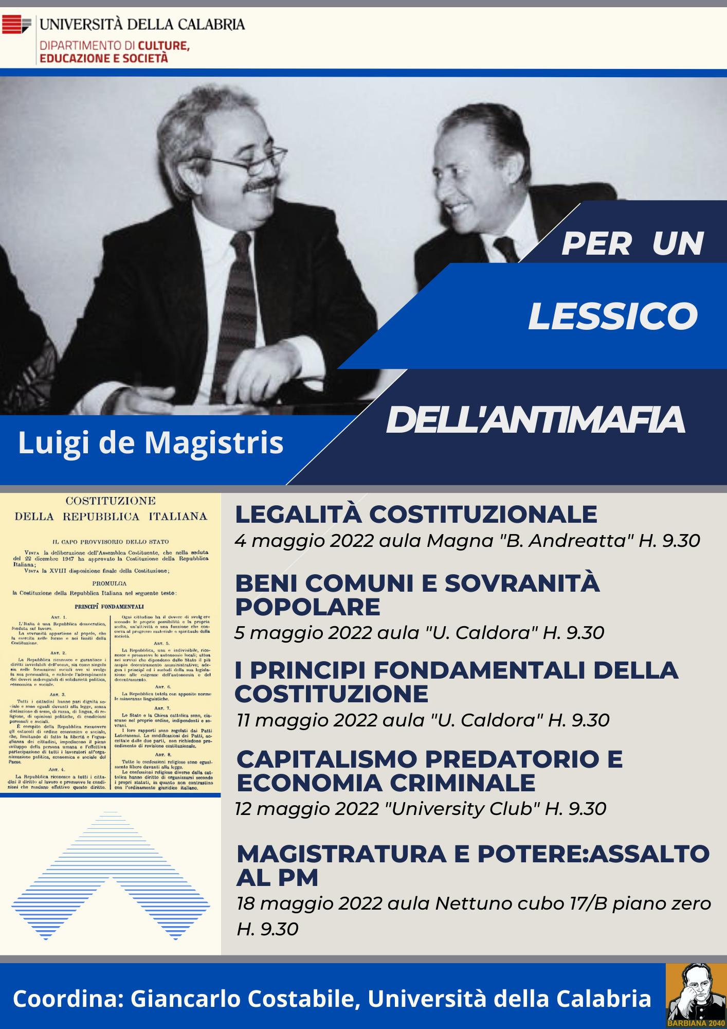 Mercoledì 4 maggio alle 9.30 nell’Aula Magna Beniamino Andreatta dell’Unical inizierà un ciclo seminariale dedicato alla costruzione di un lessico dell’antimafia, trent’anni dopo le stragi di Capaci e via d’Amelio. Il percorso di studio e riflessione sarà animato dalle conferenze magistrali di Luigi de Magistris, già pubblico ministero presso la Direzione Distrettuale Antimafia di Catanzaro nei primi anni del Duemila e autore di importanti inchieste giudiziarie tese a scardinare il sistema di potere masso-mafioso calabrese (e non solo). L’ex procuratore, già ospite di Pedagogia della R-Esistenza nel novembre 2016 da sindaco di Napoli, aprirà il ciclo seminariale discutendo di legalità costituzionale, tema chiave della pedagogia di don Milani, per proseguire con beni comuni e sovranità popolare (giovedì 5 maggio ore 9.30 nell’aula Caldora del Centro Residenziale), i principi fondamentali della Costituzione (mercoledì 11 maggio ore 9.30 nuovamente in Caldora), capitalismo predatorio e economia criminale (giovedì 12 maggio ore 9.30 presso la sala conferenze dell’University Club), magistratura e potere (mercoledì 18 maggio ore 9.30 nell’aula Nettuno cubo 17/B piano zero).