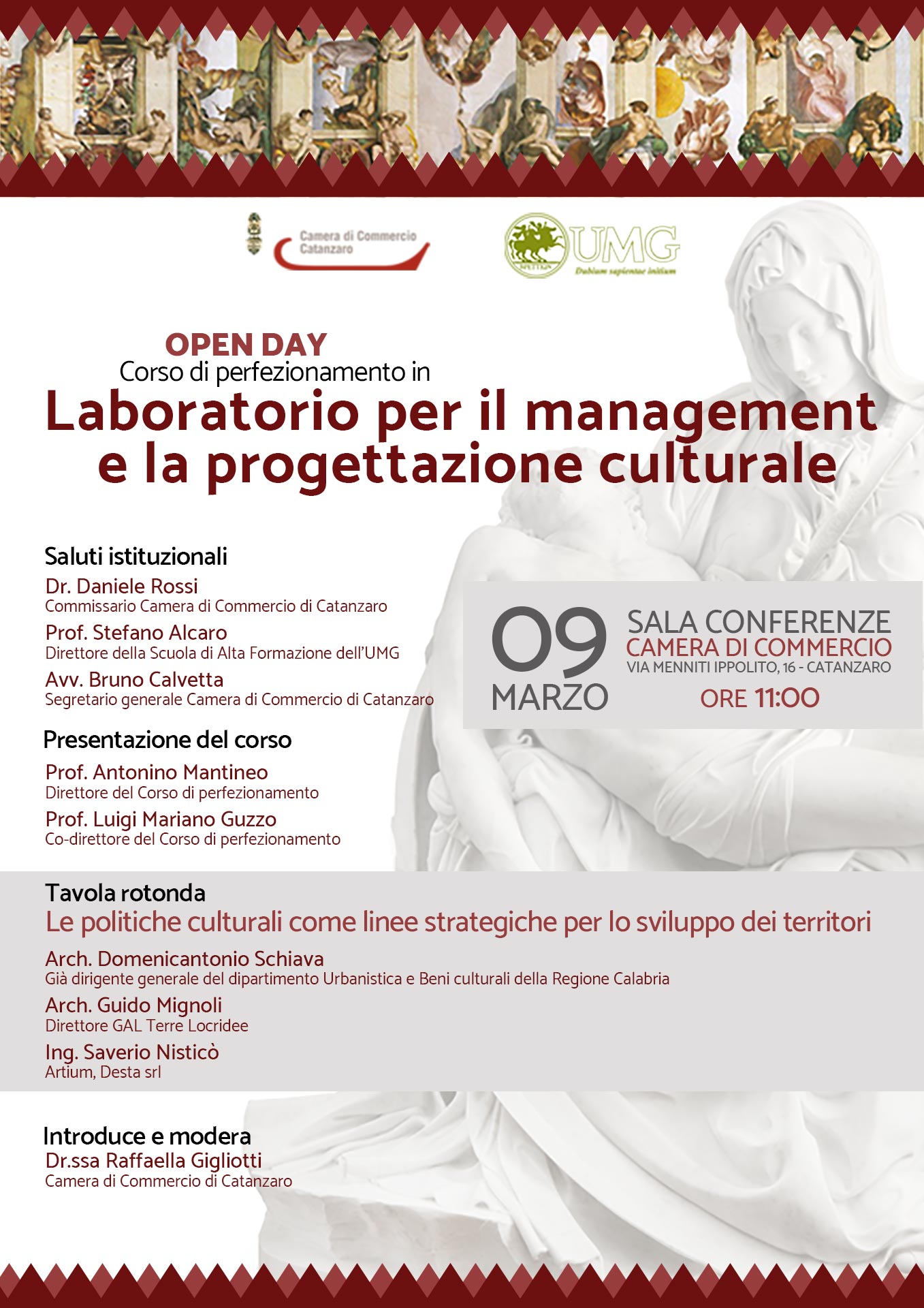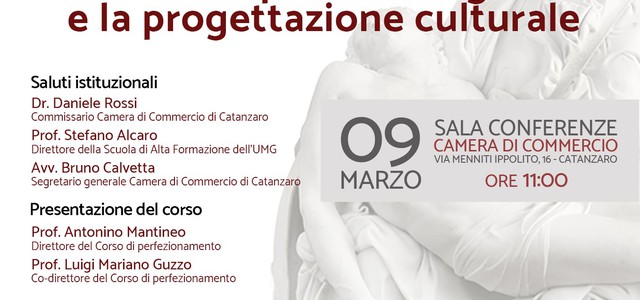 Domani, mercoledì 9 marzo, alle ore 11, la Camera di Commercio di Catanzaro ospiterà l’open day di presentazione del corso di perfezionamento in “Laboratorio per il management e la promozione culturale”, percorso promosso dalla Scuola di Alta Formazione dell’Università “Magna Graecia”.
