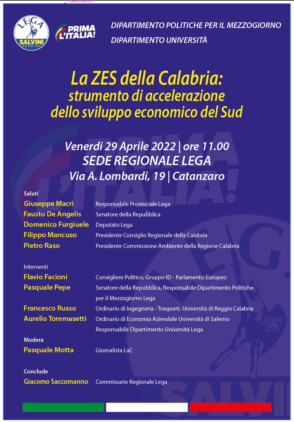 Roma, 27 apr. - "Rilanciare il tessuto produttivo del Mezzogiorno, sfruttando le ampie potenzialità delle Zone Economiche Speciali (Zes). É questo l'obiettivo primario che, come Lega, ci siamo dati e che spiegheremo al mondo imprenditoriale e a quello accademico durante i lavori del convegno “La Zes della Calabria: strumento di accelerazione dello sviluppo economico del Sud", che si svolgerà venerdì 29 aprile, alle ore 11, presso la sede regionale della Lega a Catanzaro in via A. Lombardi, 19. Grazie all'impegno dei dipartimenti Politiche per il Mezzogiorno e Università del partito, insieme ai coordinamenti regionale e provinciale, analizzeremo le misure previste nel disegno di legge, come il coordinamento delle attività svolte nelle diverse Zes, l’autonomia finanziaria e amministrativa per l’operatività delle strutture commissariali, l’istituzione di un fondo unico, oltre alla messa in campo di numerosi strumenti che possano attrarre nuovi investimenti. É oramai irrinunciabile sburocratizzare il Paese e facilitare gli investimenti nelle aree produttive del Mezzogiorno tramite lo strumento delle Zes: la Lega lavora perché la ripartenza del nostro Paese sia la ripartenza della nostra straordinaria comunità".