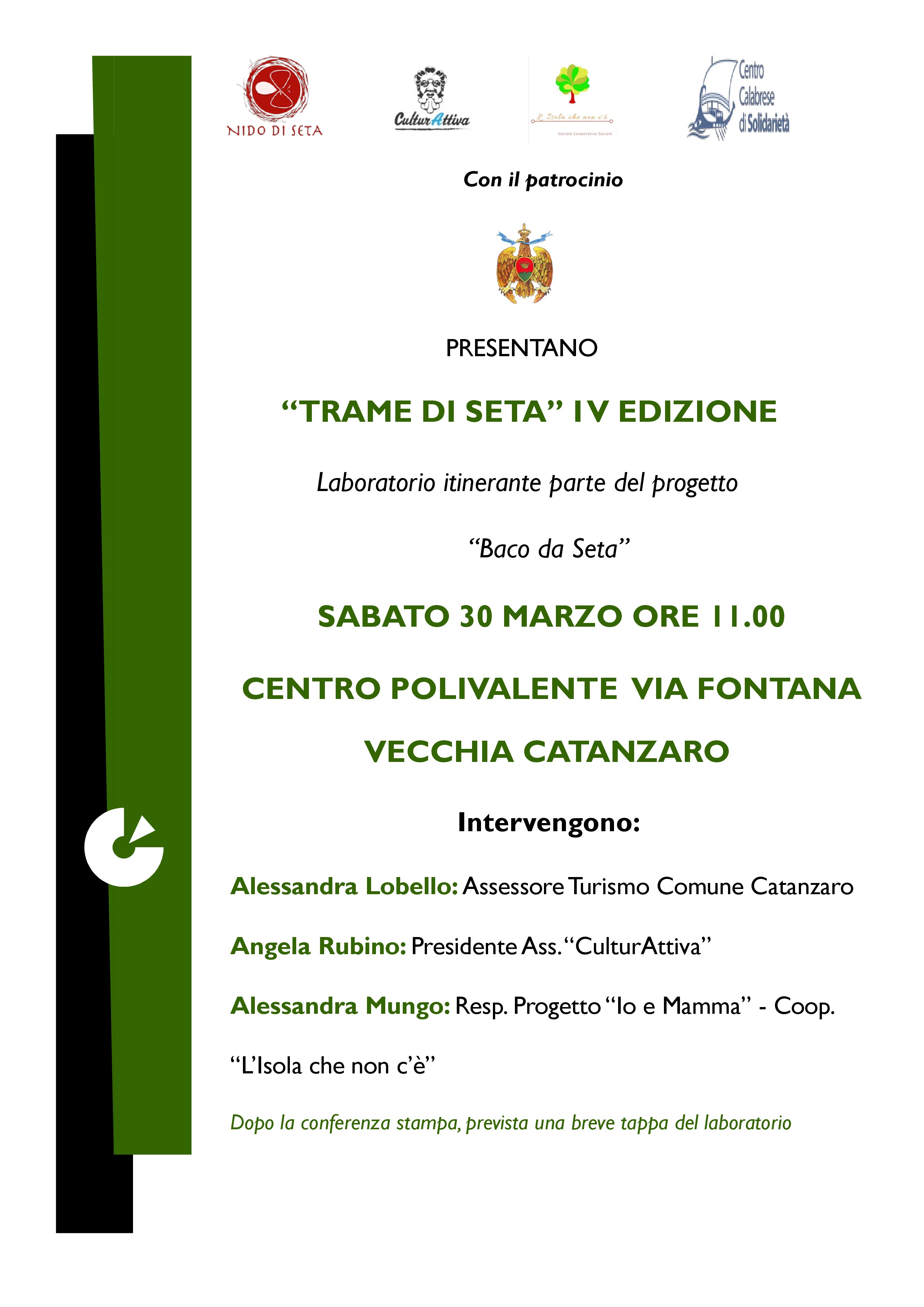 "CulturAttiva", insieme a "Nido di Seta", alla Cooperativa "L'Isola che non c'è", con il supporto del Comune di Catanzaro e del Centro Calabrese di Solidarietà: una rete fattiva che, lo scorso anno, ha permesso di portare in città oltre 1500 studenti provenienti da tutta la Calabria. La conoscenza della Nobile Arte della Seta è il focus del laboratorio e il cuore antico della città di Catanzaro il teatro di attività che intrecciano al racconto storico, la trasmissione di valori educativi e motivazionali che si riallacciano al tema proposto. Sabato 30 marzo, per la prima volta, si svolgerà in anteprima una tappa straordinaria del laboratorio, che vedrà come protagonisti gli allievi di alcune classi dell'Istituto Comprensivo "Galluppi" di Catanzaro.