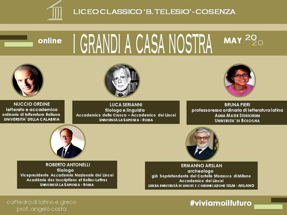 Sono intervenuti i professori: Nuccio Ordine, ordinario di letteratura italiana presso l'Università della Calabria e saggista di fama mondiale che ha parlato dell'Utilità dell'inutile ai tempi del coronavirus; poi il grande linguista e filologoLuca Serianni,accademico della Crusca ed accademico dei Lincei, dell'Università La Sapienza di Roma, amico del 'Telesio', che ha parlato dei traguardi culturali al termine del liceo classico: una lezione mirabile ed interessantissima per gli studenti. E poi ancora, Bruna Pieri, ordinaria di letteratura latina dell'Università di Bologna, una delle maggiori studiose di Agostino, che ha parlato del tempo nell'autore cristiano. Utilissima lezione anche in vista degli esami di stato e dell'ormai famoso elaborato. E' stata poi la volta del filologo, vicepresidente Accademia Nazionale dei Lincei, membro dell'Académie des Inscriptions et Belles-Lettres, Università La Sapienza di Roma, Roberto Antonelli che ha tenuto una bellissima lezione sui classici, spaziando da Omero, a Virgilio fino a Dante; ed infine, il grande archeologo, Ermanno Arslan, già Soprintendente del Castello Sforzesco di Milano, nonché accademico dei Lincei e docente presso la Libera università di lingue e comunicazione IULM di Milano, che ha tenuto una lezione molto interessante per gli studenti raccontando la sua esperienza sullo scavo di Scolacium legandolo al mondo classico.