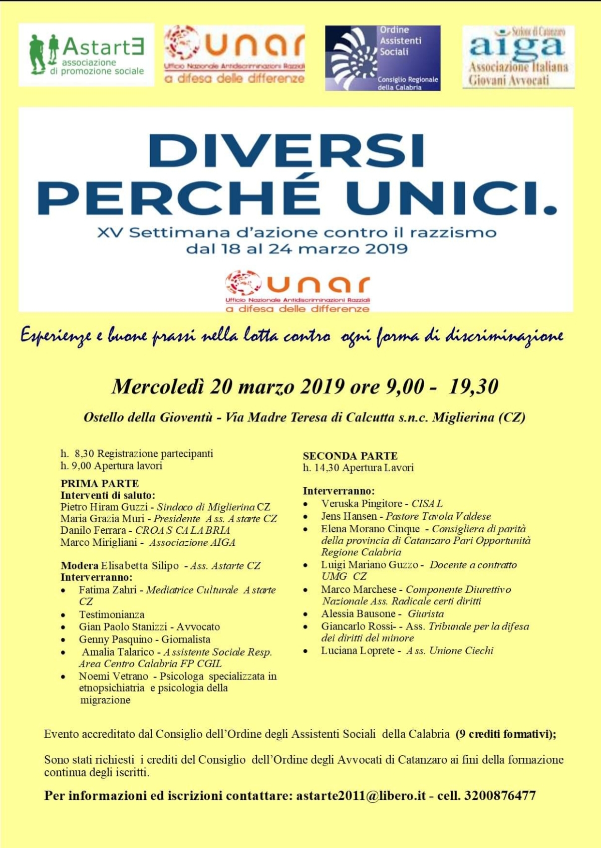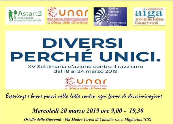 L'iniziativa prevista da ASTARTE si terrà, in data 20 marzo 2019 nella Sala Convegni dell' Ostello della Gioventù a Miglierina (Cz), consisterà in un convegno a cui è stato attribuito lo stesso titolo della manifestazione :"DIVERSI PERCHE' UNICI - Esperienze e buone prassi nella lotta contro ogni forma di discriminazione".