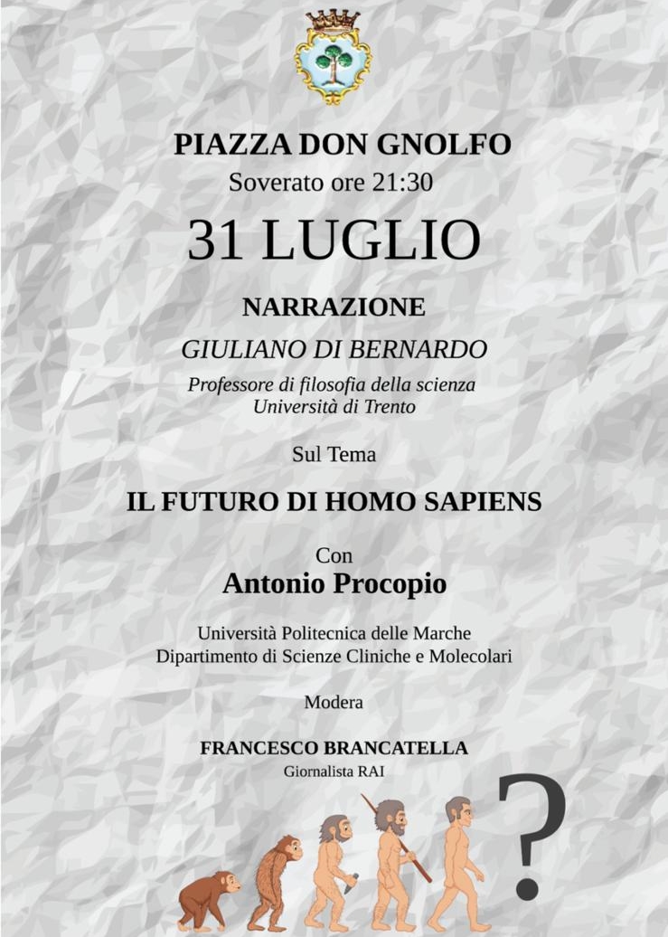 Mercoledì 31 luglio, a Soverato, ore 21,30 in Piazza Don Gnolfo, un'intervista-dibattito percorre l'evoluzione del destino dell'homo sapiens, tra filosofia, antropologia e medicina molecolare.