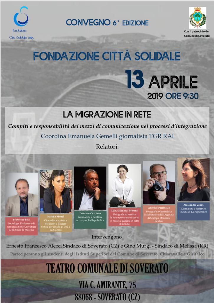 Quest’anno si è scelto di dare spazio ad una tematica di grande attualità: “L’Immigrazione in RETE. Compiti e responsabilità dei mezzi di comunicazione nei processi di integrazione”. Il fenomeno migratorio, che rappresenta di per sé un’opportunità e arricchimento, è troppo spesso accompagnato da campagne mediatiche che enfatizzano la paura ed il sospetto per tutte le diversità, trasmettendo messaggi che stigmatizzano intere popolazioni, sulla base di comportamenti individuali. Diventa fondamentale contribuire ad annullare tale distanza e favorire lo sviluppo di un corretto ed equilibrato senso di appartenenza e di integrazione. La funzione dei mezzi di comunicazione nei processi di integrazione degli immigrati è di fondamentale rilievo per aiutare a superare antichi stereotipi e a muoversi nella direzione di una reale conoscenza delle condizioni di vita nei Paesi d’origine, dei loro universi culturali e delle loro legittime aspirazioni per il futuro. Per questo motivo, si è scelto di presentare il lavoro portato avanti da giornalisti, scrittori, artisti e persone impegnate nel sociale, con ruoli e funzioni differenti, ma che contribuiscono a comunicare e creare spazi di dialogo. Saranno presenti Francesco Pira, Professore di Comunicazione presso l’Università degli studi di Messina, Karima Moual che scrive per Il Sole 24 ore e La Stampa, oltre ad essere inviata di Mediaset e blogger, Francesco Viviano, Giornalista e scrittore per La Repubblica, Luisa Menazzi Moretti, Fotografa ed artista, che espone le sue opere in musei e gallerie di tutto il mondo, Antonio Parrinello, Fotografo e giornalista che collabora con l’Agenzia di Stampa Mondiale Reuters, Alessandra Ziniti, Giornalista, scrittrice ed inviata di La Repubblica. Per l’occasione, inoltre, si è scelto di coinvolgere gli Istituti scolastici del territorio, che realizzeranno dei video sul tema dell’immigrazione da pubblicare in rete, per sensibilizzare all’uso dei social, non solo con la finalità di “condividere” la propria vita in un mondo virtuale, ma per “contribuire” a costruire una società dell’accoglienza e dell’integrazione. Interverranno, tra gli altri, il sindaco di Soverato Ernesto Alecci e quello di Melissa (Kr) Gino Murgi. La manifestazione “Premio Città Solidale” seguirà quella di giorno 12 presso il Palazzo della Provincia di Catanzaro, dove verrà presentato il Bilancio Sociale 2014/18: momenti di sensibilizzazione ma anche di presentazione di un nuovo e maggiore impegno di Fondazione Città Solidale su tutto il territorio. Testimonianza di un cambiamento anche di immagine e comunicazione che l’Ente, presieduto da Padre Piero Puglisi, vuole mettere sempre più in atto al fine di aiutare in modo professionale e consapevole quanti sono ai margini della società per problematiche differenti. Alla fine della manifestazione verrà consegnato ad ogni ospite un riconoscimento per il lavoro e l’impegno svolto nella creazione di spazi comunicativi in riferimento al fenomeno migratorio.