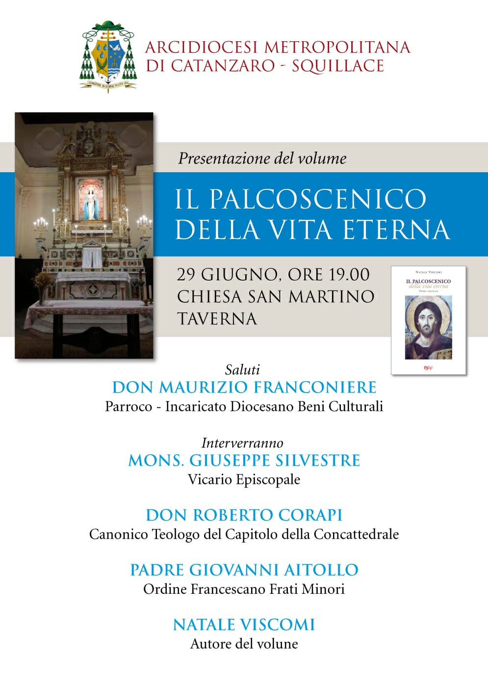 Sabato 29 giugno presso la Chiesa di San Martino a Taverna, alle ore 19, sarà presentato il libro “Il Palcoscenico della vita eterna” di Natale Viscomi. A porgere i saluti sarà don Maurizio Franconieri, parroco incaricato diocesano beni culturali. Interverranno: mons. Giuseppe Silvestri, vicario episcopale, don Roberto Corapi, canonico teologo del Capitolo della Concattedrale, padre Giovanni Aitollo, Ordine francescano frati minori.