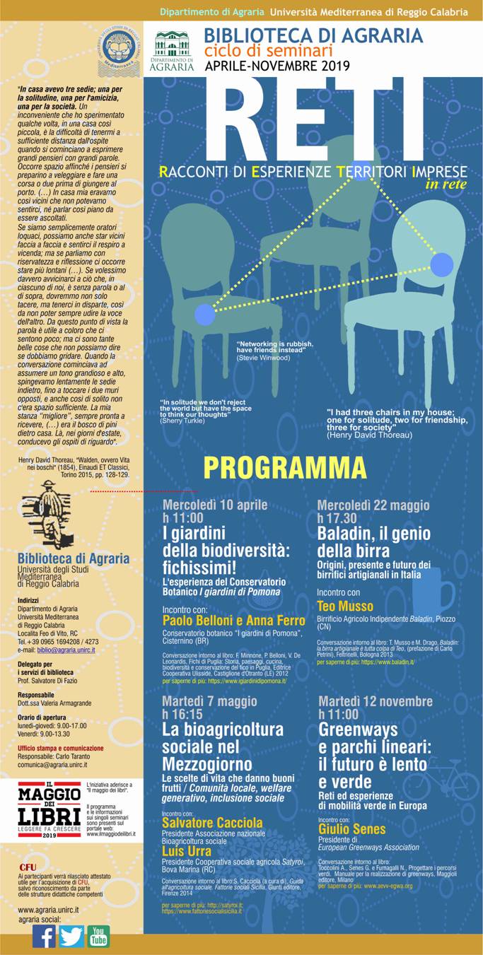 Prende avvio il 10 aprile il nuovo ciclo di seminari della Biblioteca del Dipartimento di Agraria dell’Università Mediterranea di Reggio Calabria intitolato quest’anno “RETI: Racconti di Esperienze, Territori, Imprese”. L’iniziativa che si svolgerà dal 10 aprile al 12 novembre 2019 partecipa alla campagna nazionale “Il maggio dei libri 2019” e prevede la presentazione di volumi collegati da un comune filo tematico, attraverso l’incontro con gli autori. Il ciclo si articola in quattro seminari nei quali verranno presentate esperienze che nel mondo rurale (e non solo), a partire dalla condivisione di un chiaro orizzonte etico, stabiliscono trame di relazioni che vanno ben oltre il semplice networking, contribuendo a costruire spazi vivibili, innovando le espressioni del lavoro e offrendo esempi concreti di socialità rinnovata.