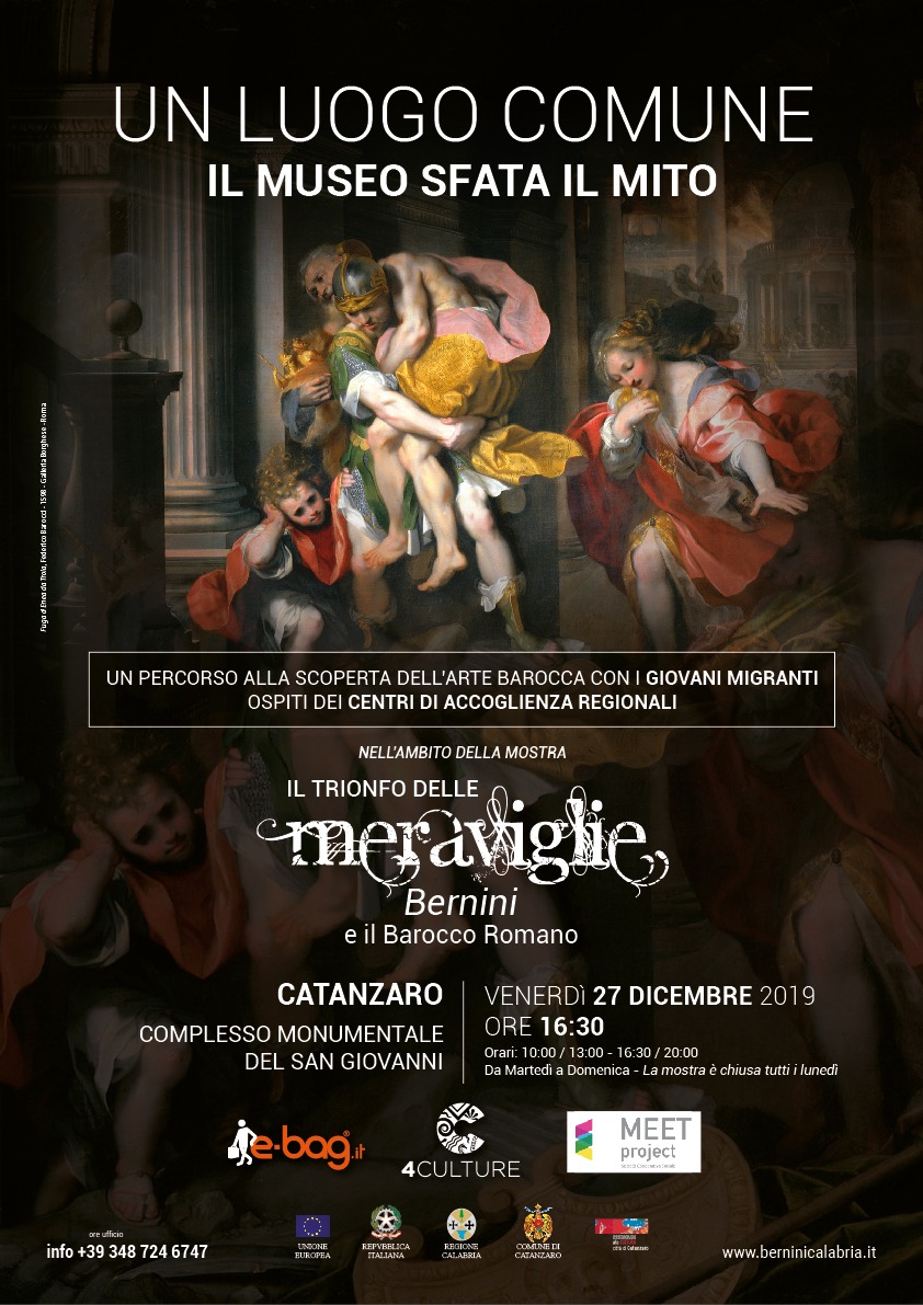 Che cos’è un museo se non un luogo di partecipazione e condivisione? Una grande piazza di incontro e di scambio di saperi ed esperienze multiculturali, oltre che uno spazio preposto alle attività di studio, valorizzazione e conservazione del patrimonio culturale. Dalla collaborazione tra 4culture, e-bag e la cooperativa sociale Meet Project nasce a Catanzaro il progetto pilota “Un luogo comune. Il Museo sfata il mito”. Il primo appuntamento si terrà al Complesso monumentale San Giovanni venerdì 27 dicembre, alle ore 16.30, dove si svolgerà un itinerario di visita inedito, alla scoperta della mostra “Il trionfo delle meraviglie. Bernini e il barocco romano”, con i giovani migranti, ospiti dei centri di accoglienza regionali.