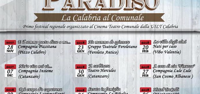 La UILT Calabria (Unione Italiana Libero Teatro), l’Associazione Culturale Incanto e il Cinema teatro Comunale, presentano la prima edizione della rassegna teatrale NUOVO TEATRO PARADISO, un evento che vedrà gareggiare 11 tra le migliori compagnie teatrali amatoriali calabresi. Un modo per far conoscere alla cittadinanza catanzarese il valore del teatro amatoriale, da poco inserito anche nei progetti del Ministero dei beni culturali, avendone riconosciuto il valore non solo culturale ma anche sociale. La rassegna, inizierà il 28 novembre e terminerà il 6 marzo. La compagnia che risulterà vincitrice, oltre a ricevere un assegno di 500 euro, parteciperà di diritto alle selezioni per il Festival UILT Nazionale. In questo straordinario contesto, grazie all’intervento di Francesco Passafaro, direttore artistico del Comunale e direttore regionale del Centro Studi UILT, l’ente che coordina la formazione teatrale delle compagnie aderenti, il Festival Nazionale si terrà nel Cinema Teatro Comunale da settembre 2018. Un’occasione per far conoscere la Calabria ma, in particolare, la nostra città alle compagnie che provengono da fuori regione e che porteranno il loro modo di fare teatro, la loro cultura e le loro tradizioni. Compagnie in gara e calendario -28 novembre 2017 Compagnia Pizzitana (Pizzo Calabro) E il sommo poeta disse a me... -07 dicembre 2017 Compagnia Insieme (Catanzaro) Ntr'a vita nci vò... -09 gennaio 2018 Compagnia I commedianti (Soveria Mannelli) Ppè curpa d'o caputrenu -16 gennaio 2018 Compagnia La Torre (Torre Melissa) U masculunu 'i papà -23 gennaio 2018 Gruppo Teatrale Feroletano (Feroleto Antico) Na mamma de spinnare -30 gennaio 2018 Teatro Hercules (Catanzaro) 'A carbinera -6 febbraio 2018 Compagnia La Ribalta (Vibo Valentia) Serata in famiglia -13 febbraio 2018 Compagnia Il Sorriso (Isola Capo Rizzuto) Tra moglie e marito... -20 febbraio 2018 Nati per caso (Vibo Valentia) La villa degli olmi -27 febbraio 2018 Compagnia Lule Lule (San Cosmo Albanese) A casa di zia "Finucca" -6 marzo 2018 Ottantotto100 sensi artistici (Catanzaro) Hotel Tre Colli