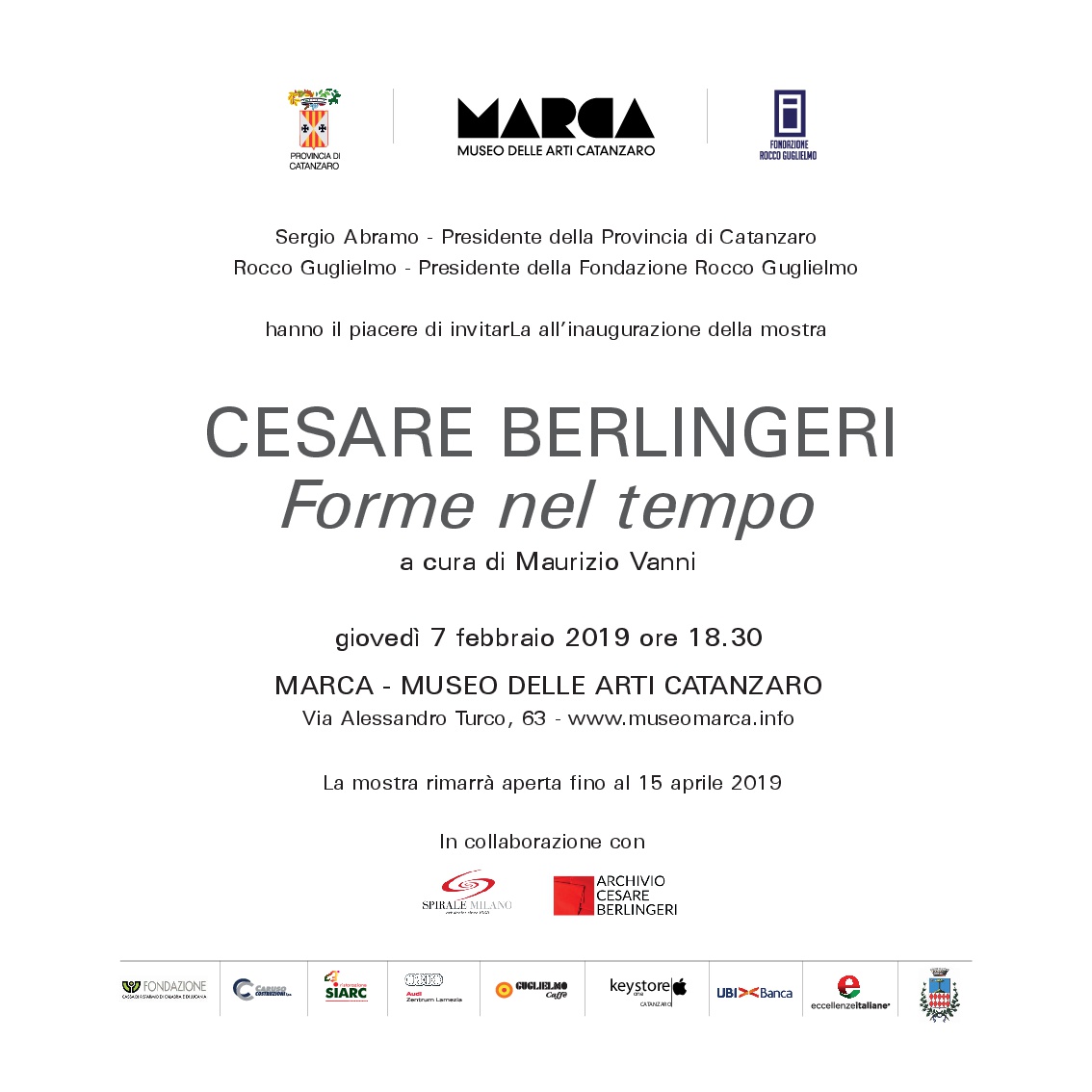 Dall’8 febbraio al 15 aprile 2019, il MARCA - Museo delle Arti di Catanzaro, diretto da Rocco Guglielmo, celebra Cesare Berlingeri (Cittanova, RC, 1948), uno degli artisti calabresi più apprezzati e conosciuti del panorama delle arti visive nazionali e internazionali.