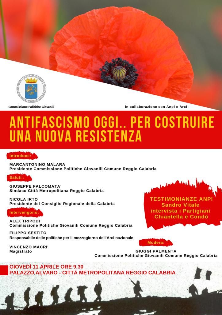 “Oggi la nuova Resistenza in cosa consiste”? Prendendo spunto dall’appello che il presidente Pertini rivolse ai giovani il 31 dicembre 1983, la Commissione Politiche Giovanili del Comune di Reggio Calabria in collaborazione con ARCI e ANPI invita gli studenti, i docenti e la cittadinanza tutta a partecipare all’iniziativa: “Antifascismo oggi: come costruire una nuova Resistenza” che si terrà giovedì 11 aprile alle ore 9.30 presso la Sala Perri, a Palazzo Alvaro.