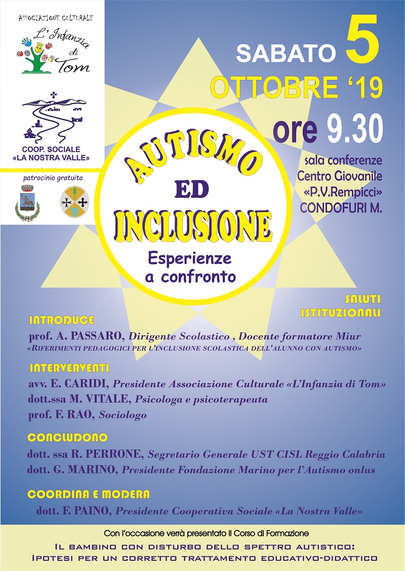 Sabato 05 Ottobre 2019 alle ore 9.30 si terrà presso la Sala Conferenze del Centro Giovanile Padre Valerio Rempicci un convegno dal titolo “AUTISMO ED INCLUSIONE: ESPERIENZE A CONFRONTO”, organizzato dall’Associazione culturale L’infanzia di Tom, in collaborazione con la Coop. Soc. La nostra Valle, nel quale i relatori presenti Prof. A. Passaro, Avv. E. Caridi, Dott.ssa M. Vitale, Dott. F. Rao, e per concludere Rosy Perrone, segretario Generale Cisl RC, e G. Marino Fondazione per l’Autismo Onlus, avranno l’opportunità di dialogare e confrontarsi su un tema attualmente dibattuto, quale è appunto l’inclusione del soggetto affetto da disturbo dello spettro autistico e rappresentare il contributo che gli stessi sono stati invitati a fornire durante il Corso di Formazione“ Il bambino con disturbo dello spettro autistico: ipotesi per un corretto trattamento educativo-didattico” che partirà il prossimo 18 Ottobre.