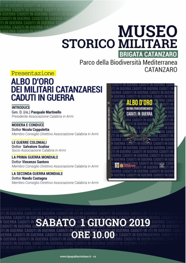 L'associazione "Calabria in Armi" ha organizzato, per Sabato 1 giugno 2019 alle ore 10,00 presso il Museo Storico Militare – Brigata Catanzaro – Parco della Biodiversità Mediterranea di Catanzaro, una conferenza per la presentazione dell’Albo d’Oro dei caduti catanzaresi caduti in guerra.