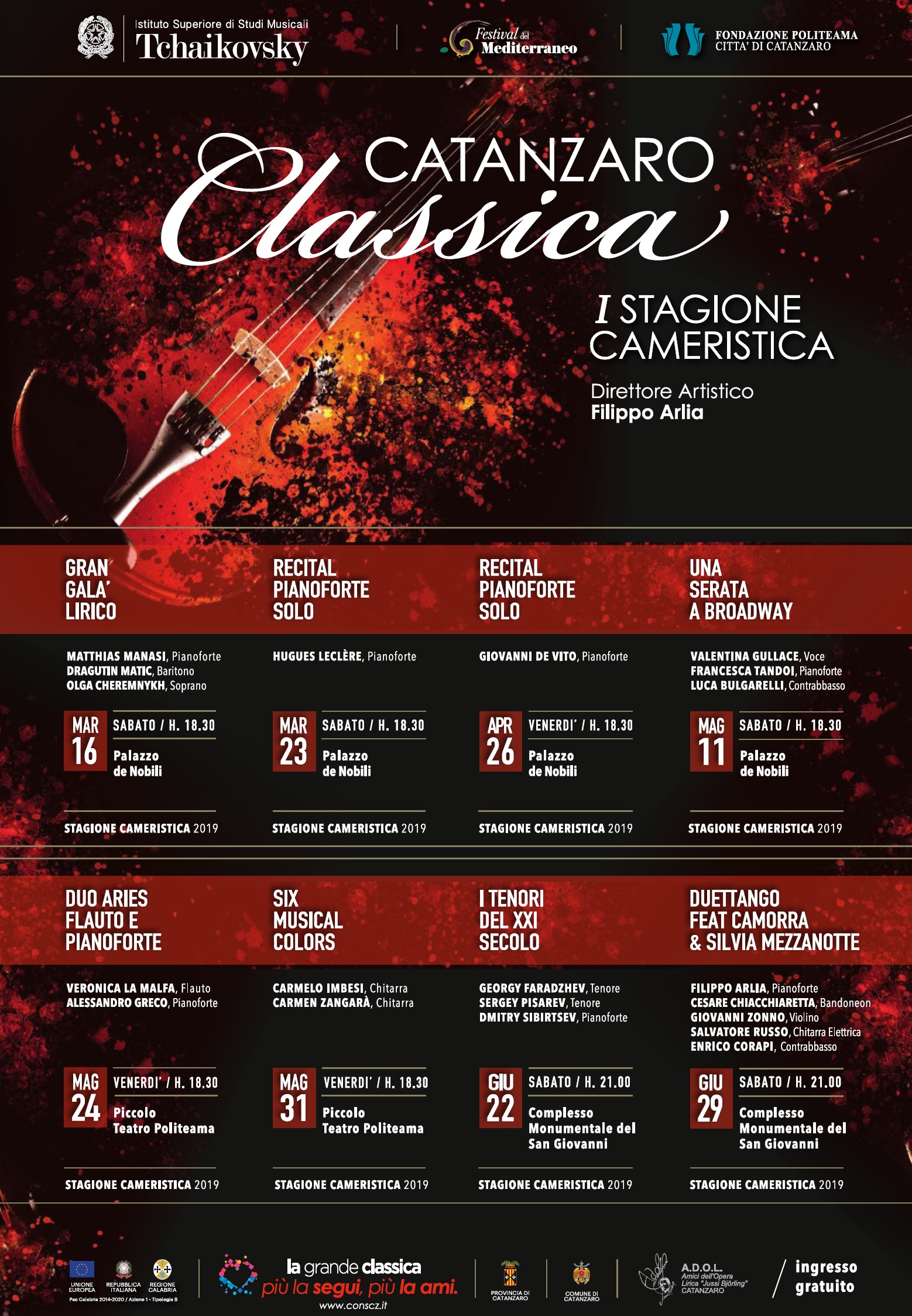 “La musica da camera – ha concluso il maestro Arlia - a differenza della sinfonica, si affida ad un numero ristretto di interpreti; le atmosfere che si creano sono assolutamente straordinarie, esaltano il rapporto con la melodia e con gli interpreti, suscitano emozioni intense ed una partecipazione ancora più diretta di chi ascolta. I musicisti che abbiamo coinvolto sono straordinari interpreti, i luoghi nei quali si terranno i concerti - il Piccolo del Politeama, Palazzo De Nobili ed il Complesso Monumentale del San Giovanni - ci raccontano di una città sorprendente che merita un ruolo di primo piano nell’offerta musicale regionale. Anche per questo, la stagione cameristica è un omaggio alla città di Catanzaro”.