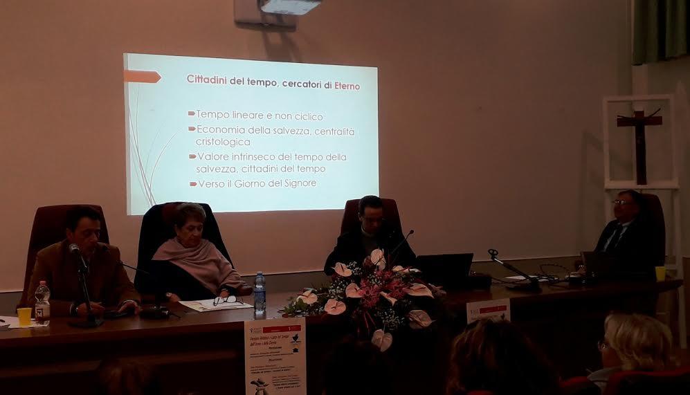 A relazionare sul tema “Cittadini del tempo, cercatori di eterno” è stato don Francesco Brancaccio, docente di Teologia dell’Istituto teologico di Cosenza e Catanzaro, preceduto dal dottor Salvatore Toti Licata, sociologo, criminologo e formatore dell’Università degli Studi di Milano-Bicocca che si è soffermato sul tema “Tempo: eterno passeggero. L’Essere umano qui e ora”.