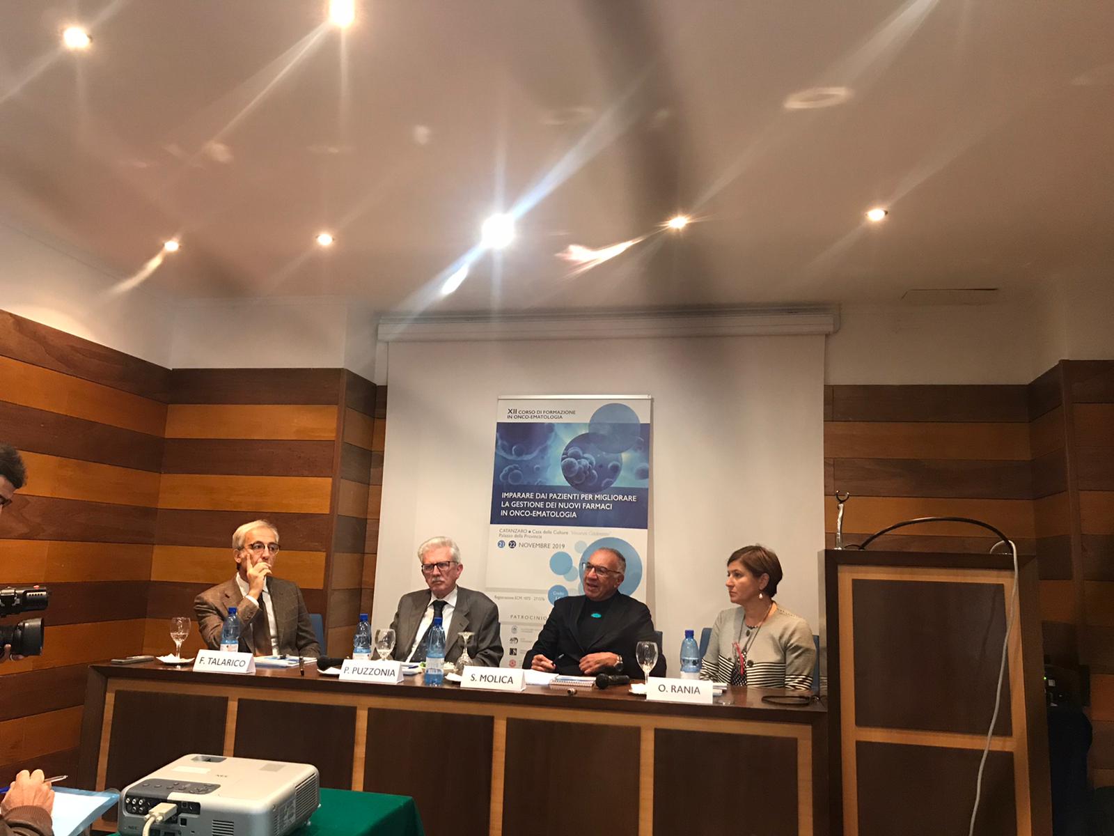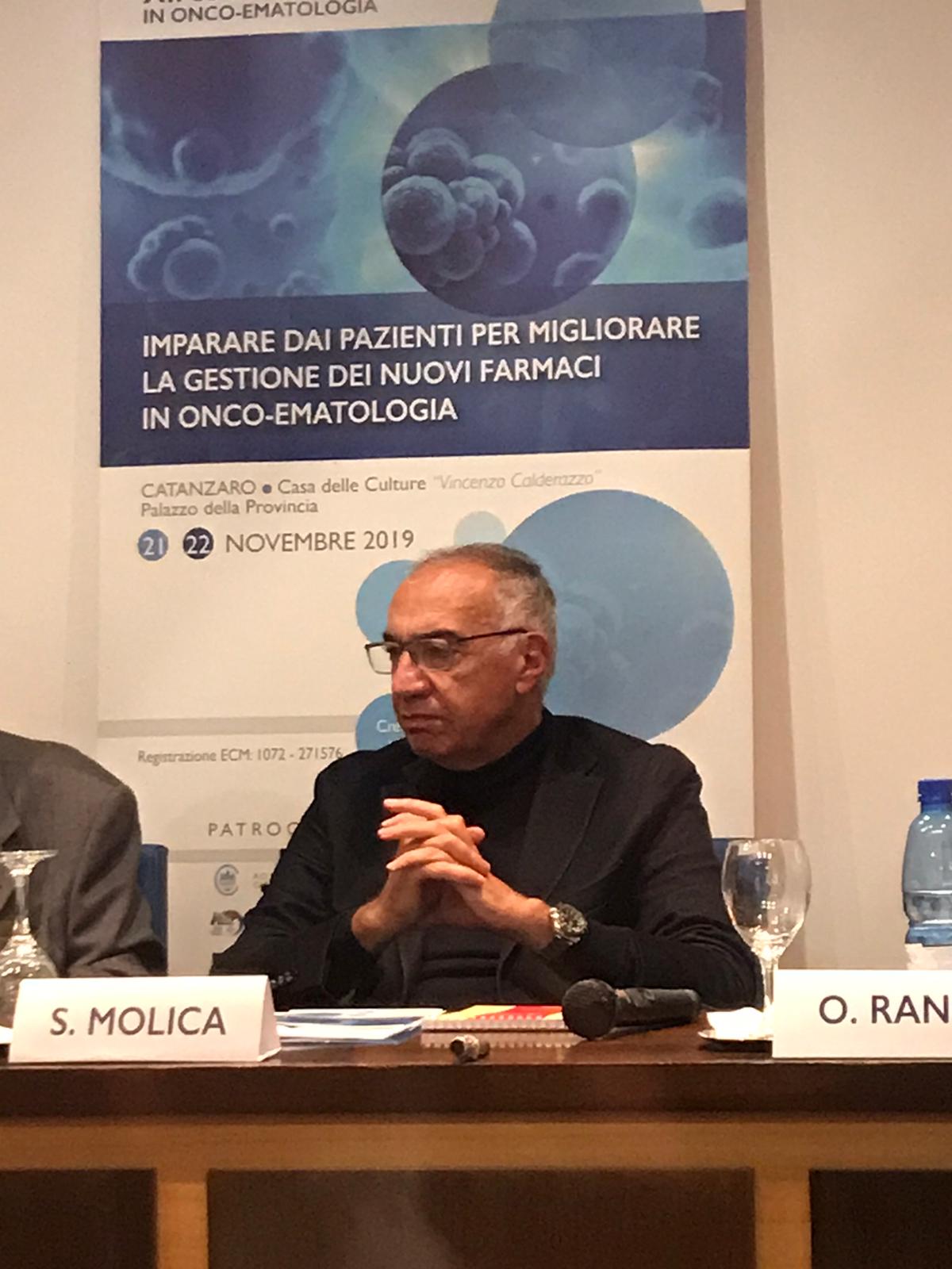 «Nel novembre del 1969 apriva i battenti il reparto di Ematologia dell’Azienda Ospedaliera Pugliese-Ciaccio. Il primo reparto di Ematologia in Calabria e fra i primi del sud Italia. – ha ricordato Molica, proseguendo - Questo la dice lunga sulla tradizione e sulla storia nell’ambito di una specialità che va a curare dei pazienti con una patologia complessa e particolare». E ricordando i passi avanti fatti in questi anni dalla medicina e dalla scienza medica nell’ambito delle patologie tumorali, ha aggiunto:«Il continuo evolversi della scienza medica e dei farmaci onco-ematologici, ha fatto ricadere la scelta del tema di questo anno sul rapporto con il paziente. Di questo patto che crediamo debba esistere costantemente con esso, in una logica che non è “unidirezionale” dal medico al paziente ma viceversa. E, imparare dal paziente per una migliore gestione della patologia e per una migliore gestione dei farmaci è anche il nuovo modo di vedere e gestire le nuove terapie che, nella maggior parte dei casi, sono terapie orali che - per i sintomi che possono far insorgere nel paziente, per la possibile tossicità o complicanze ad esse legate - mettono il paziente difronte ad una consapevolezza notevole».