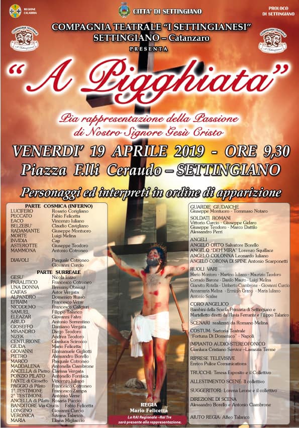 Venerdì 19 Aprile 2019 si svolgerà l'opera della pigghiata(La Presa) che si rappresenta dai i tempi antichi a Settingiano. L'opera viene preparata periodicamente dagli appassionati delle tradizioni popolari, che si rivelano sempre in tanti fra i Settingianesi e che collaborano in varie forme dalla partecipazione diretta nella rappresentazione teatrale, alle preparazioni delle strutture, delle scenografie e di quanto altro necessario per l'allestimento dell'opera, alla contribuzione volontaria che si dimostra sempre generosa e spontanea.