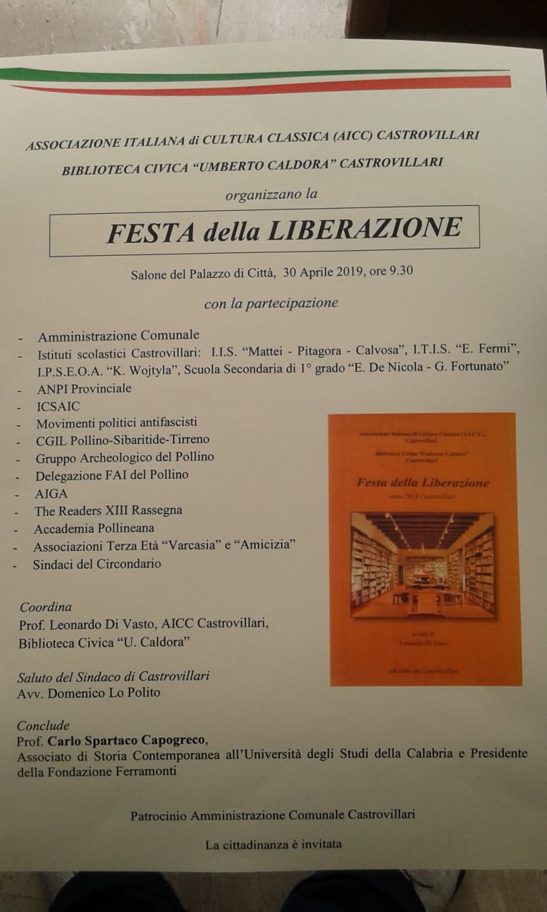 Il Sindaco di Castrovillari, Domenico Lo Polito, martedì 30 aprile , alle ore 9,30, nel salone delle adunanze consiliari del Palazzo di città, porterà il saluto dell’Amministrazione comunale ,alla Festa della Liberazione organizzata dall’Associazione Italiana Cultura Classica e la Biblioteca “Umberto Caldora” nell’ambito del Maggio dei Libri.