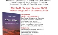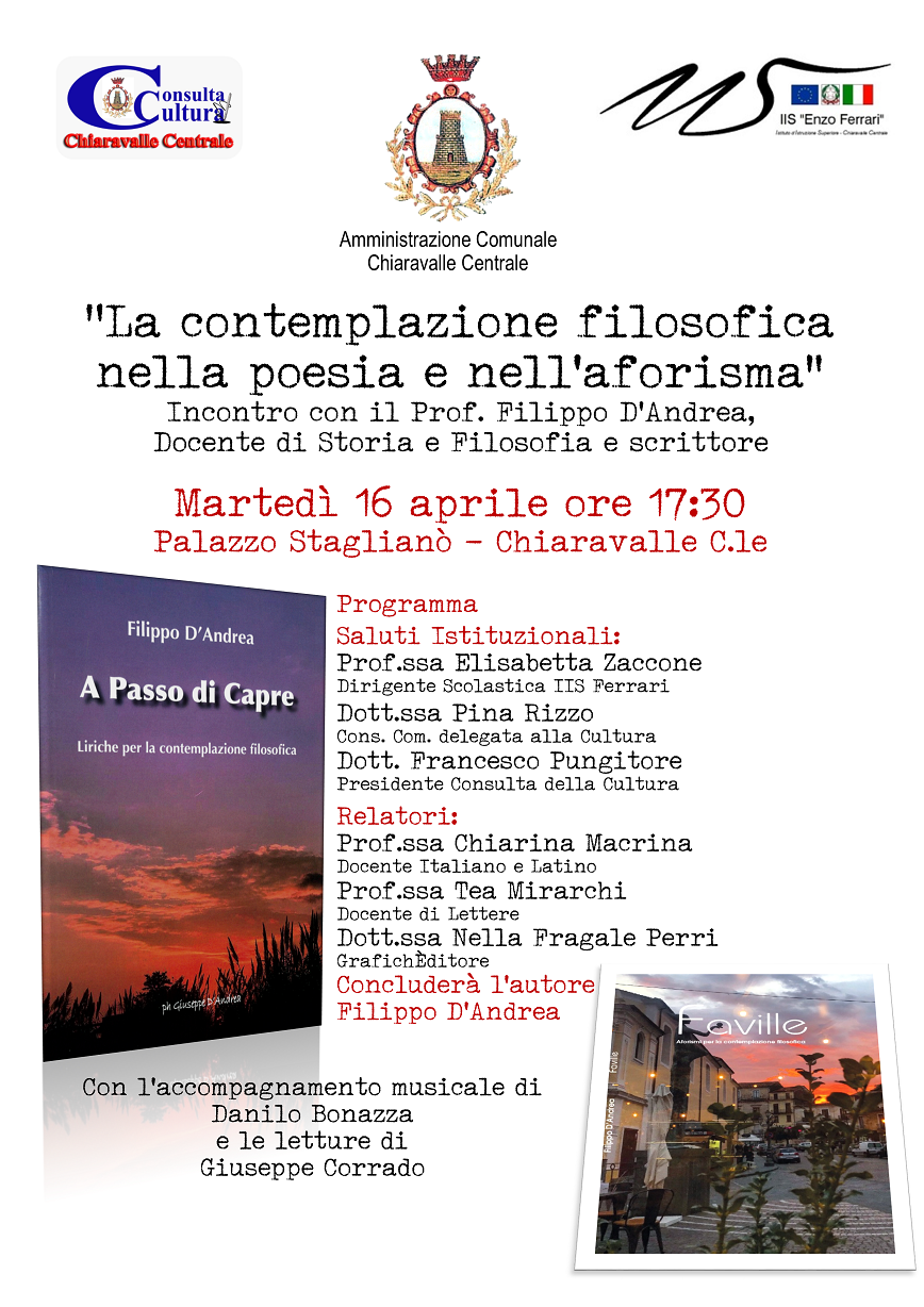 “La contemplazione filosofica nella poesia e nell'aforisma”. Questa la traccia dell'incontro in programma domani, martedì 16 aprile, a Chiaravalle Centrale. I lavori prenderanno il via alle ore 17.30, nella sala convegni di Palazzo Staglianò. Una iniziativa promossa dalla Consulta comunale della Cultura di Chiaravalle Centrale, con il patrocinio dell'amministrazione comunale e la fattiva collaborazione dell'Iis “Enzo Ferrari”. Al centro della riflessione due libri a firma del prof. Filippo D'Andrea, docente di Storia e Filosofia presso lo stesso istituto superiore “Ferrari”. Opere come “A passo di capre” che elogiano la lentezza come cammino di massima consapevolezza, per essere pienamente presenti nei territori della vita. Il tutto nell'ottica di un servizio di crescita interiore, sia di natura intellettuale che spirituale, giacché viene proposto il linguaggio poetico come cibo sapienziale nel crocevia della pluralità culturale. La poesia, secondo D'Andrea, è “parola estetica” su cui praticare la contemplazione filosofica, colta meditazione profonda di senso, ricerca di paesaggi ulteriori, scavo nei significati intimi dell'anima, viaggio nei luoghi nascosti del pensare. E poi, gli aforismi racchiusi nel libro “Faville”. Dopo i saluti istituzionali dell'amministrazione comunale, della Consulta della Cultura e della dirigente scolastica, Elisabetta Zaccone, relazioneranno le docenti Chiarina Macrina, Tea Mirarchi e l'editore Nella Fragale Perri. Concluderà l'autore, Filippo D'Andrea. L'iniziativa sarà accompagnata dalle letture recitate di Giuseppe Corrado e dagli intermezzi musicali di Danilo Bonazza.