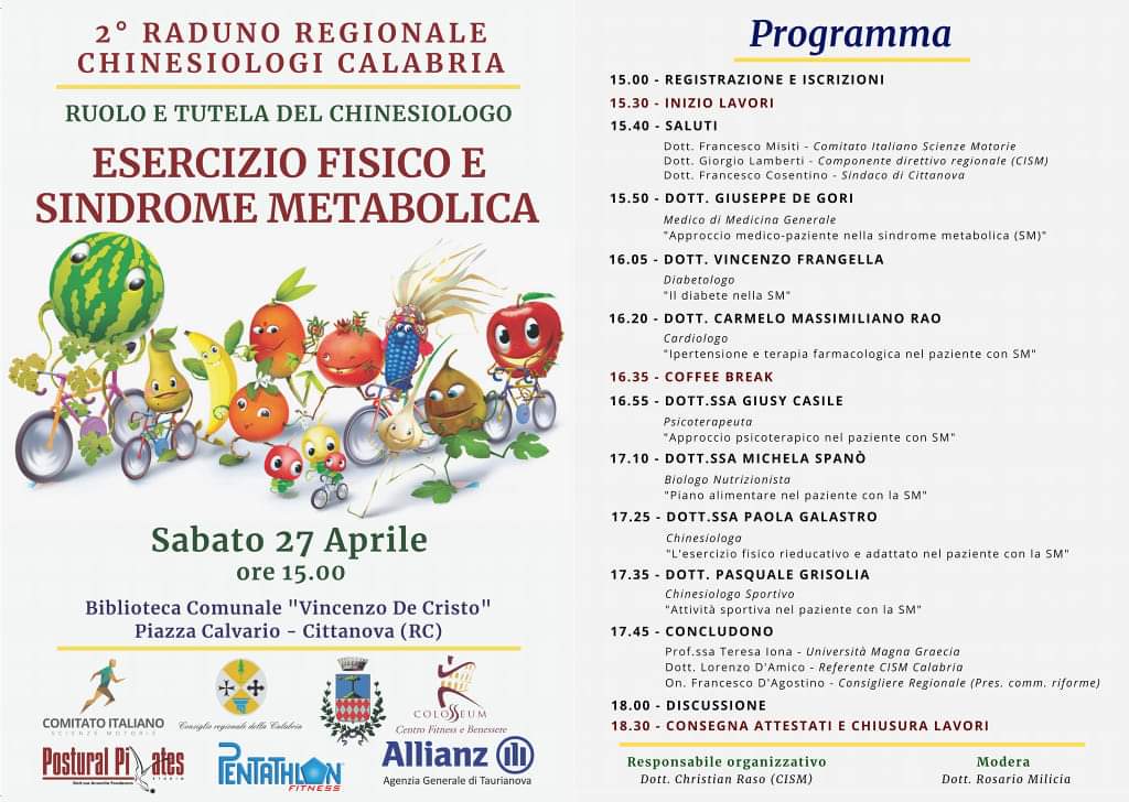 Quest’ anno a ospitare il Raduno dei Chinesiologi sarà la cittadina pianigiana situata ai piedi dello Zomaro. L’evento, organizzato ancora una volta dal direttivo regionale del Comitato Italiano Scienze Motorie, quest’ anno ha visto la collaborazione della Dott.ssa Annarita Fondacaro, chinesiologa, che ha manifestato sin da subito la voglia di organizzare l’ evento nella sua cittadina. Il tema dell’ incontro tratterà un argomento ampio e complesso come la sindrome metabolica, condizione patologica molto frequente nella popolazione adulta, e il relativo esercizio fisico. Inoltre si discuterà della tutela e del riconoscimento della figura del professionista delle Scienze Motorie. Oltre ai Chinesiologi, a prendere parte saranno presenti, in veste di relatori, alcuni professionisti del settore medico, una rappresentanza dell’ Università Magna Graecia di Catanzaro e anche il consigliere regionale Francesco D’Agostino.