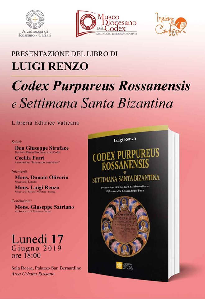 Lunedì 17 giugno, alle ore 17, nella Sala Rossa di Palazzo S. Bernardino area urbana Rossano, sarà presentato il nuovo libro di Mons. Renzo dal titolo Codex Pupureus Rossanensis e Settimana Santa Bizantina, edito dalla Libreria editrice Vaticana.