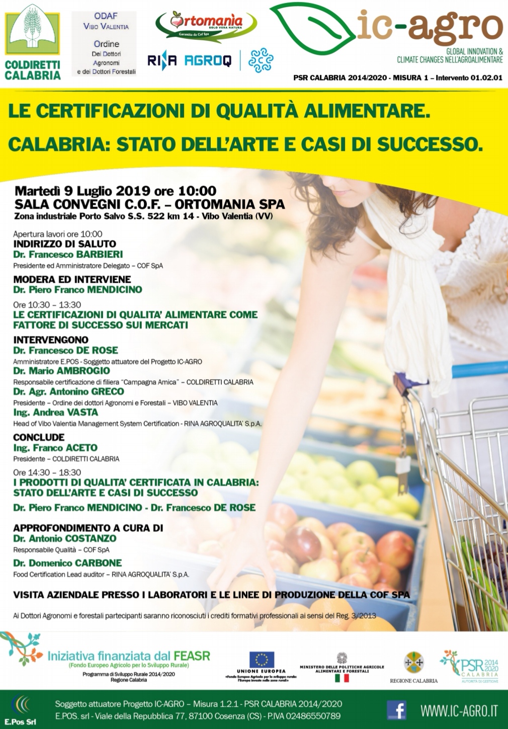La certificazione di processo e di prodotto è sempre più centrale nell'agroalimentare, garantisce il made in Italy di tutta la filiera e le prerogative che ne derivano. Per incentivare e consolidare questo, che rappresenta sul mercato un indubbio valore aggiunto per le aziende, si svolgerà martedì 9 luglio (domani) dalle ore 10,00, nella Sala Convegni COF-Ortomania SpA Zona Industriale Porto Salvo S.S. 522 km 14 a Vibo Valentia un qualificato seminario dal titolo “ La certificazione di qualità alimentare. Calabria: stato dell’arte e casi di successo”. Dopo l’intervento introduttivo del dr. Francesco Barbieri, Presidente e Amministratore Delegato – COF spa, azienda al’avanguardia nei sistemi di certificazione di qualità, ci saranno interventi di specialisti proprio a rimarcare l’esigenza della certificazione di qualità, poiché sono tanti gli operatori della distribuzione e della commercializzazione che la esigono, per poter valorizzare i prodotti agricoli. Il seminario, che sarà concluso dal Presidente di Coldiretti Catanzaro Crotone Vibo Fabio Borrello, prevede anche la visita aziendale presso i laboratori e le linee di produzione dell’azienda COF. Diffondere un nuovo approccio all’agroalimentare – precisa Coldiretti - marcando, con il controllo qualità, la necessità di un’autoregolamentazione volta a garantire il buon servizio al territorio e al consumatore di tutta la filiera contribuisce ad avvicinare sempre di piùle aziende ai cittadini –consumatori e alimenta il circolo virtuoso per concretizzare il “patto con i cittadini”. Il seminario è utile per i beneficiari del premio di primo insediamento al fine di realizzare la formazione obbligatoria e, inoltre, riconosce i crediti formativi professionali ai dottori agronomi e forestali.