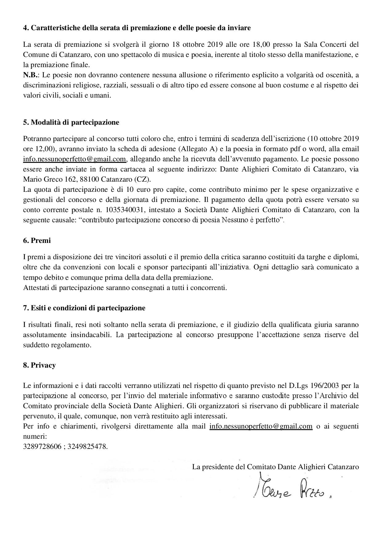 Per incentivare, come da proprio statuto e conseguenti obiettivi, la cultura cittadina e promuoverne gli sviluppi tra tutte le fasce d’età e la popolazione intera, il Comitato Dante Alighieri di Catanzaro, presieduto da Teresa Rizzo, ha bandito il concorso di poesia “Nessuno è perfetto”, I edizione, inserito appositamente in un anno, il 2019, che si configura come l’anno della poesia.Si è voluto pertanto dedicare un ulteriore spazio a questo mondo spesso incompreso, ma dai valori più genuini.