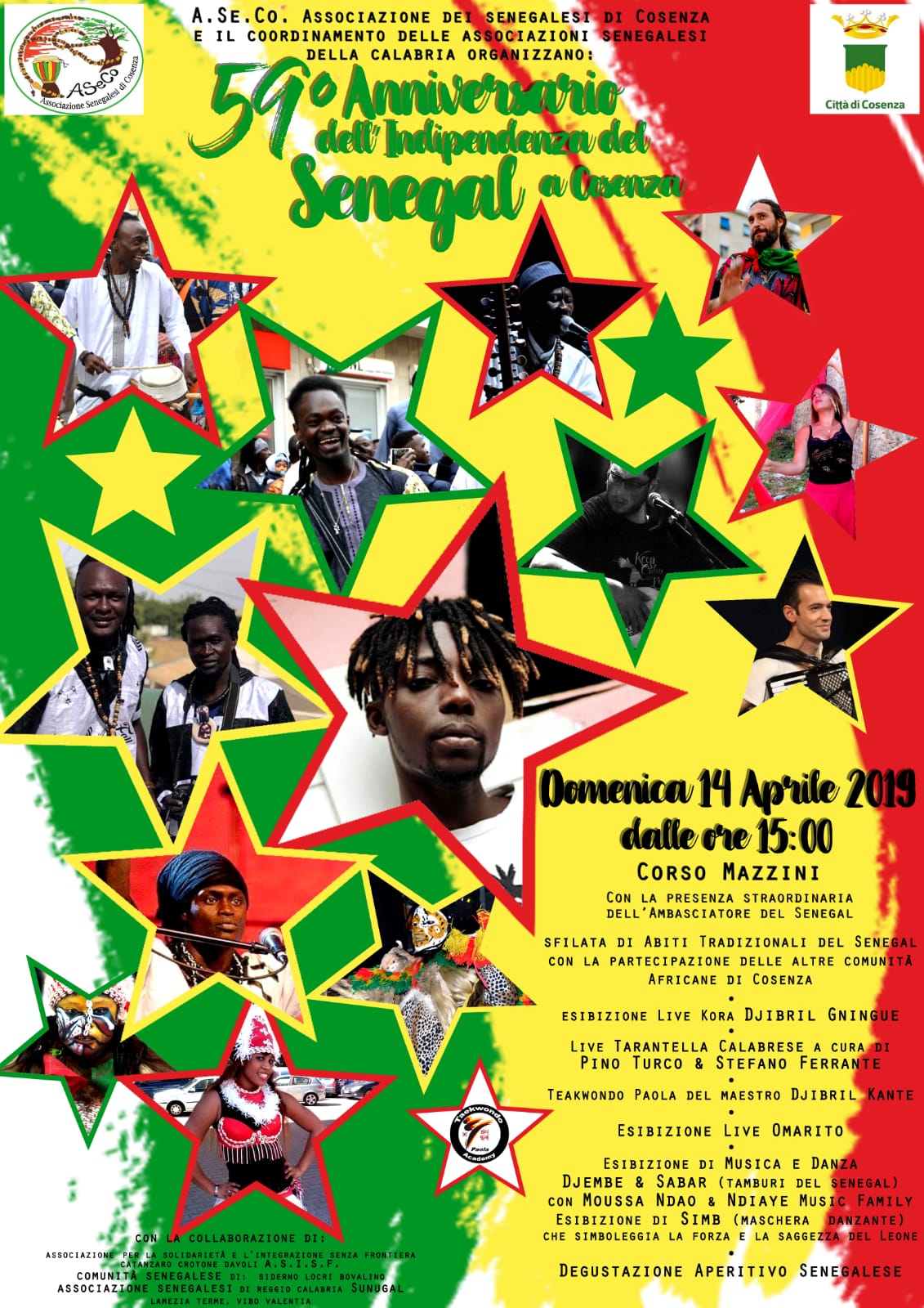 I festeggiamenti a Cosenza, organizzati dall'Associazione A.Se.Co., che raggruppa i senegalesi di Cosenza e con il coordinamento delle associazioni senegalesi della Calabria, si svolgeranno a partire dalle ore 15.00, su corso Mazzini, con la presenza straordinaria dell'Ambasciatore del Senegal in Italia. L'appuntamento sull'isola pedonale sarà scandito da tanti momenti che saranno altrettante occasioni di confronto con la cultura senegalese: i colori, con la sfilata di abiti tradizionali alla quale parteciperanno anche altre comunità africane di Cosenza; i suoni, con l'esibizione live kora di Djibril Gningue e del rapper Omarito; ancora musica e danza con i tamburi del Senegal di Djembe & Sabar e la partecipazione di Moussa Ndao e del gruppo Ndiaye Music Family. Con loro si esibisce la maschera danzante di Simb, che simboleggia la forza e la saggezza del leone. I ritmi del Senegal si sposano al live di tarantella calabrese a cura di Pino Turco e Stefano Ferrante. C'è anche spazio per il teakwondo con la dimostrazione del maestro Djibril Kante e, infine, i sapori, con la degustazione di un aperitivo senegalese.