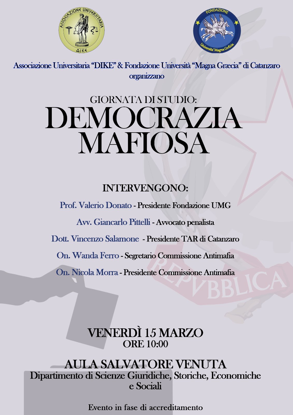 Domani venerdì 15 marzo, con inizio alle ore 10 presso l’università Magna Graecia di Catanzaro (Aula Salvatore Venuta - Dipartimento Scienze Giuridiche), si terrà la giornata di studio “Democrazia mafiosa”, alla quale interverranno il presidente della Commissione parlamentare antimafia on. Nicola Morra, il segretario della Commissione parlamentare antimafia on. Wanda Ferro, il presidente del Tar Calabria Vincenzo Salamone, l'avvocato penalista Giancarlo Pittelli e il presidente della Fondazione Umg prof. Valerio Donato.