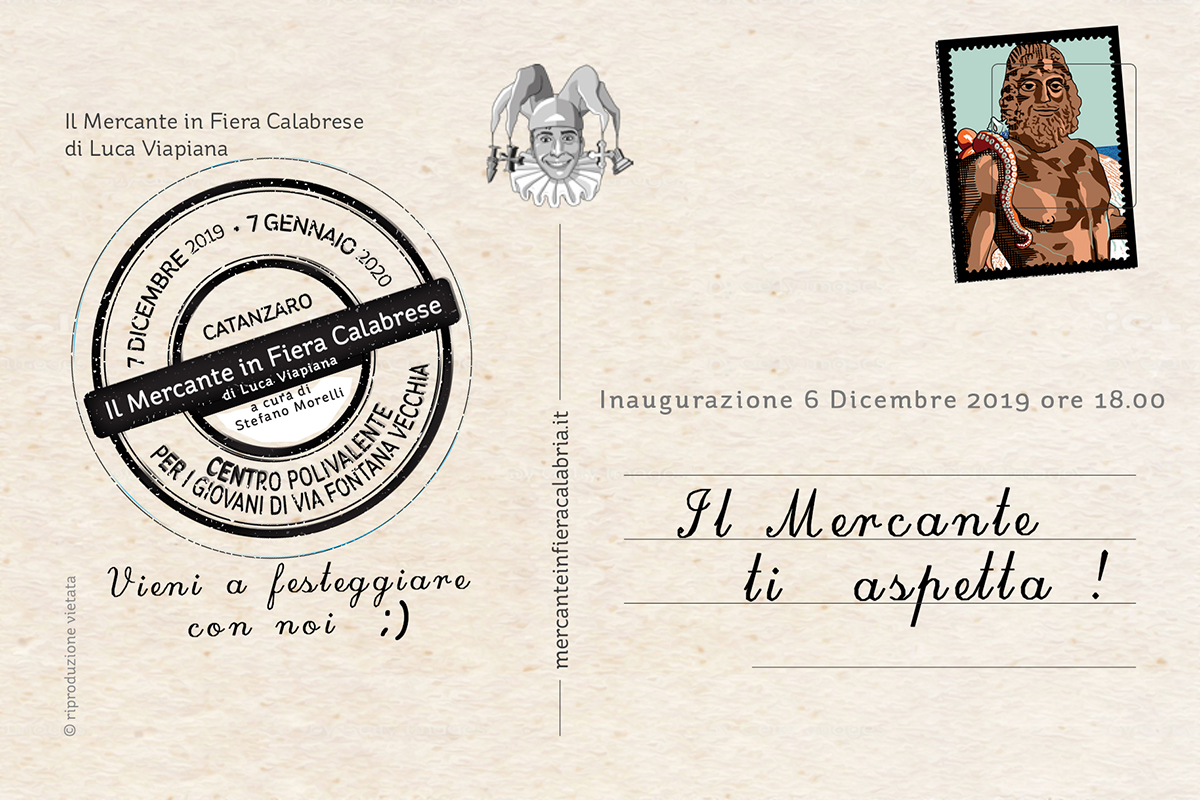 Domani, 6 dicembre alle ore 18.00 presso il Centro Polivalente per I Giovani di Via Fontana Vecchia, si darà il via alla scoperta di una Calabria nuova, inedita, elaborata dagli occhi e dallo spirito di Luca Viapiana, l’artista che, dopo la fortunata esperienza de “Il Mercante in Fiera Catanzarese”, il cofanetto Dal Negro lanciato nel 2014 e firmato Zatita Production, torna a tracciare una geografia “emotiva”, questa volta seguendo i più ampi confini regionali, con la nuova serie “Il Mercante in Fiera Calabrese”, l’esposizione, curata da Stefano Morelli, delle 40 opere grafiche che Luca Viapiana ha dedicato alla Calabria e alla sua gente. Il taglio del nastro, che avverrà alla presenza del Sindaco di Catanzaro Sergio Abramo, del presidente del Consiglio comunale, Marco Polimeni - che dopo l’esperienza di Local Popular Museum torna a sostenere il nuovo progetto calabrese - dell’assessore comunale al Turismo, Alessandra Lobello, del responsabile amministrativo dell’Assessorato all’Istruzione e alle Attività Culturali della Regione Calabria, presieduto da Maria Francesca Corigliano, Salvatore Bullotta, e della padrona di casa, Isolina Mantelli, la Presidente del Centro Calabrese di Solidarietà, che gestisce la struttura che ospita la mostra.