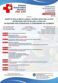 L’iniziativa formativa "Varietà della dieta lungo l'intero arco della vita" promossa dall’associazione “Studio Assistenza Ricerca For Life”,è in programma il prossimo 15 dicembre presso il Complesso Monumentale del San Giovanni, a Catanzaro, con inizio dei lavori fissato alle ore 8.30 ,l'evento ha come responsabili scientifici il prof. Santo Gratteri e la prof.ssa Carmela Colica ed è destinata alle seguenti figure professionali: medico chirurgo, infermiere, infermiere pediatrico, dietista, biologo, farmacista, psicologo, tecnico sanitario laboratorio biomedico.