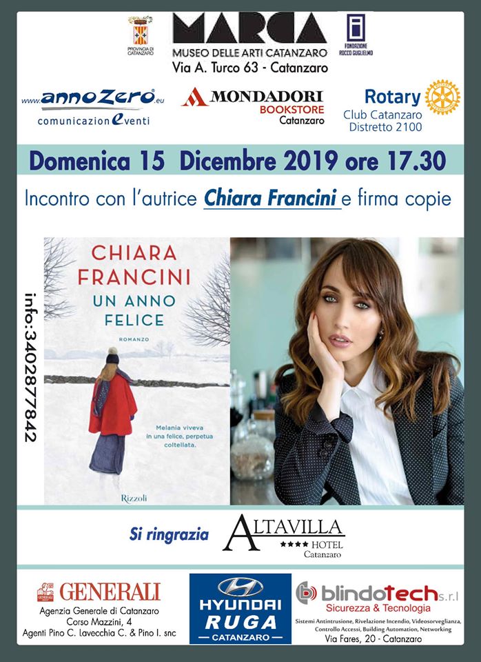 Il ciclone Francini su Catanzaro, domenica 15 dicembre alle 17.30. La travolgente e affascinante Chiara Francini, artista a tutto tondo, talentuosa attrice e scrittrice apprezzata, sarà ospite del Museo delle Arti di Catanzaro, diretto da Rocco Guglielmo, grazie all’iniziativa dell’Agenzia di Eventi AnnoZero di Salvatore Sangiuliano in collaborazione con la Mondadori BookStore e Rotary Club Catanzaro Distretto 2100 e la Fondazione Rocco Guglielmo. Interverranno:
