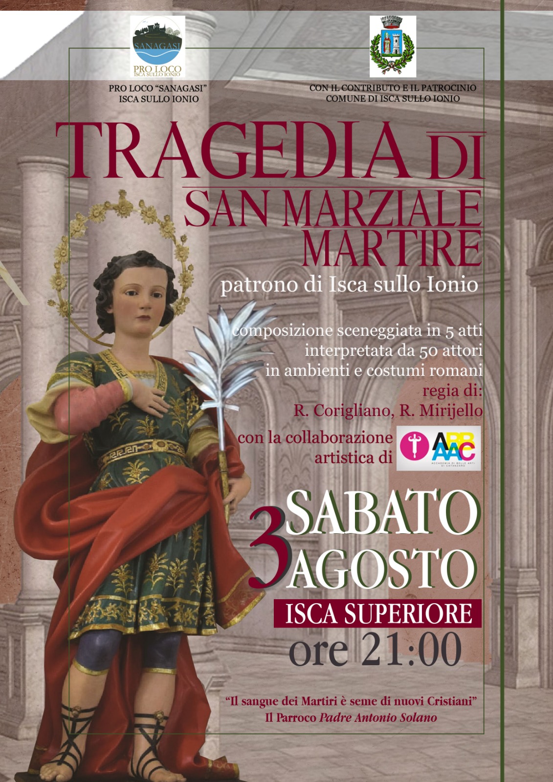 Quest’anno nella ricorrenza settennale la Tragedia di San Marziale verrà messa in scena sabato 3 agosto in piazza Giovanni Paolo II alle ore 21 a Isca Sullo Ionio, con importanti innovazioni nella regia e nella scenografia. I registi Rodolfo Corigliano e Rosario Mirijello hanno svolto in questi mesi un lavoro egregio volto a rendere la recitazione sempre più coinvolgente, le musiche sono state composte dal maestro Gianni Tirelli mentre le scene sono state attentamente studiate e realizzate da Alessia Minniti della scuola di Scenografia dell’Accademia di belle arti di Catanzaro.