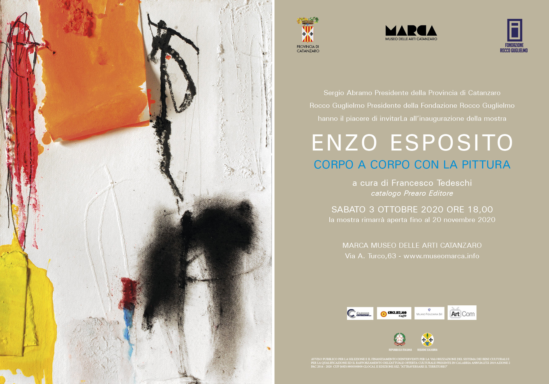 Sarà inaugurata alle 18 di oggi la mostra “Corpo a Corpo con la pittura” di Enzo Esposito, che la Fondazione Rocco Guglielmo organizza al Museo delle Arti di Catanzaro in collaborazione con l’Amministrazione Provinciale di Catanzaro e con il supporto dell’editore Giampaolo Prearo e di ArtCom.