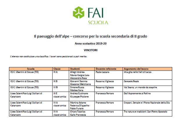 CATANZARO - Per l’anno scolastico 2019-2020, il FAI scuola, con il sostegno della “Ferrero”, ha bandito un concorso sul tema: "Il paesaggio dell'alpe. Geografia, natura, agricoltura e insediamenti rurali lungo le terre alte delle Alpi, degli Appennini e delle isole”, rivolto agli studenti delle scuole di ogni ordine e grado.