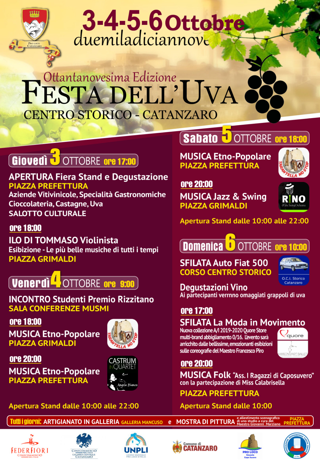 La festa dell'uva è diventata un appuntamento di riferimento delle aziende di eccellenza. Quest'anno gli espositori sono 50 di cui molti provenienti da altre regioni, ma che con i loro prodotti si integrano piacevolmente con piatti delle nostra cucina catanzarese . Non mancheranno il Morzello ed i piatti tipici della nostra città, in un appuntamento da non perdere per la qualità della preparazione dei piatti e della selezione dei vini ed uve delle nostre cantine . Si potranno, inoltre, gustare il torrone delle Madonie , i dolci tipici ed i liquori siciliani , il caciocavallo di Ciminà , la liquirizia e tanto altro. Saranno esposti i dipinti di Giovanni Marziano e dei suoi allievi e presenti opere di artigianato di San Giorgio Morgese, Seminara , Soverato. Sapori, sfilate e musica, accompagneranno la settima edizione del Premio Rizzitano, che vedrà protagonisti i ragazzi dell' ITA ''Vittorio Emanuele II'' di Catanzaro.
