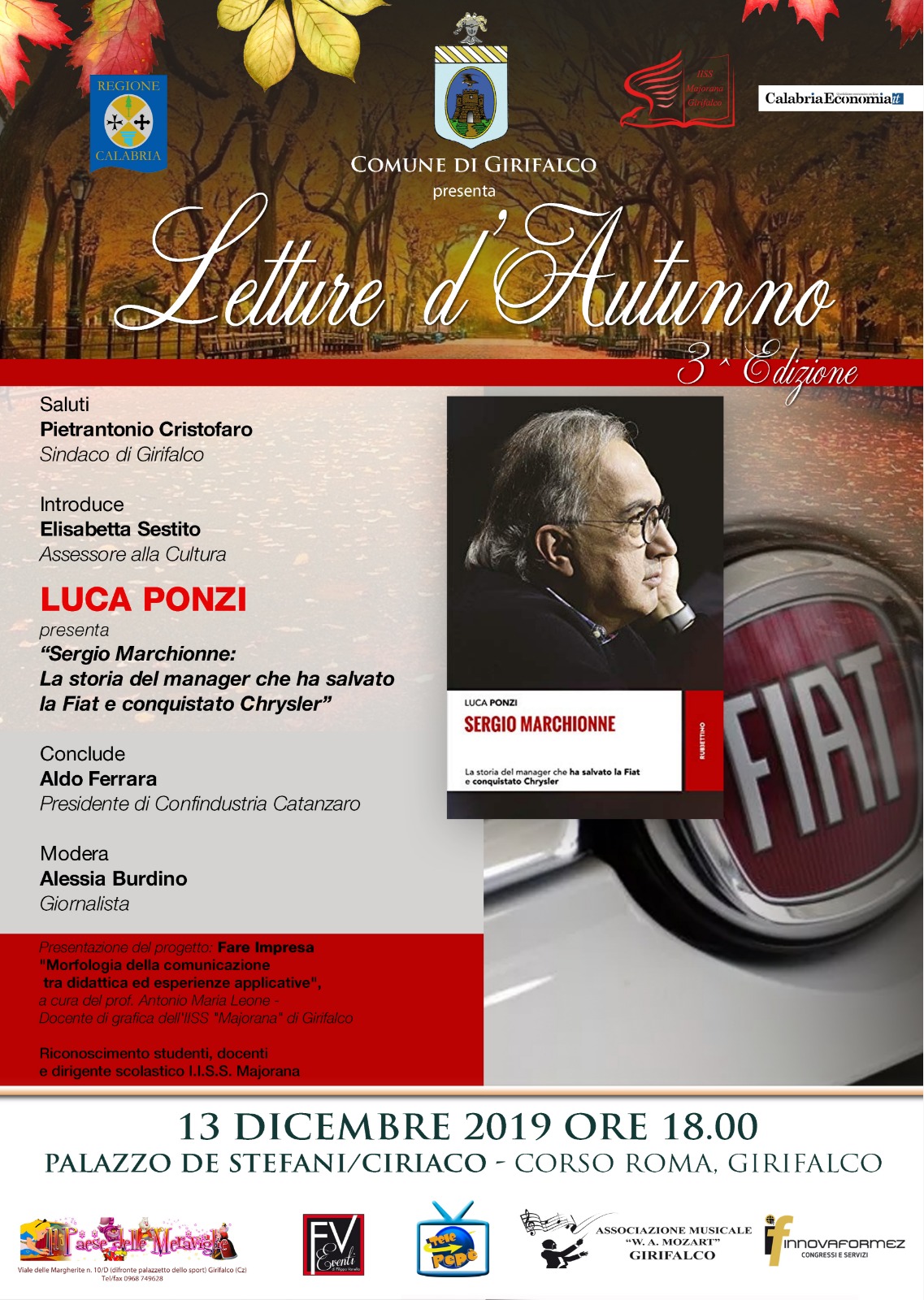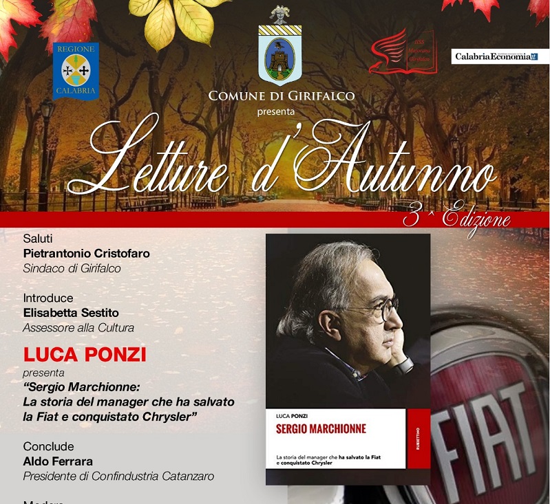 Tutto pronto per il terzo appuntamento della III edizione delle Letture d’Autunno. L’iniziativa si terrà il 13 dicembre alle ore 18 presso Palazzo Ciriaco, in via Roma, alla presenza dello scrittore Luca Ponzi che, per l’occasione, presenterà il suo libro Sergio Marchionne - La storia del manager che ha salvato la Fiat e conquistato Chrysler edito da Rubbettino. Alla manifestazione parteciperà il presidente di Confindustria Catanzaro, Aldo Ferrara. Nel corso dei lavori sarà illustrato e presentato il progetto “Fare impresa” a cura degli studenti dell’Istituto Tecnico di Girifalco. Agli studenti, ai docenti e al dirigente scolastico dell’Istituto d’Istruzione Secondaria Superiore “E. Majorana” sarà conferito un riconoscimento per l’attenzione dedicata al tema dell’economia e per le opportunità data ai giovani di conoscere meglio ilmondo del lavoro nell’ambito del progetto “Fare Impresa”. All'incontro parteciperanno, infatti, gli studenti dell'Istituto "E. Majorana" di Girifalco. Sarà infatti presentato il progetto "Fare impresa. Morfologia della Comunicazione, tra didattica ed esperienze applicative", a cura del prof. Antonio Leone, docente di Grafica dell'IIS "Majorana".