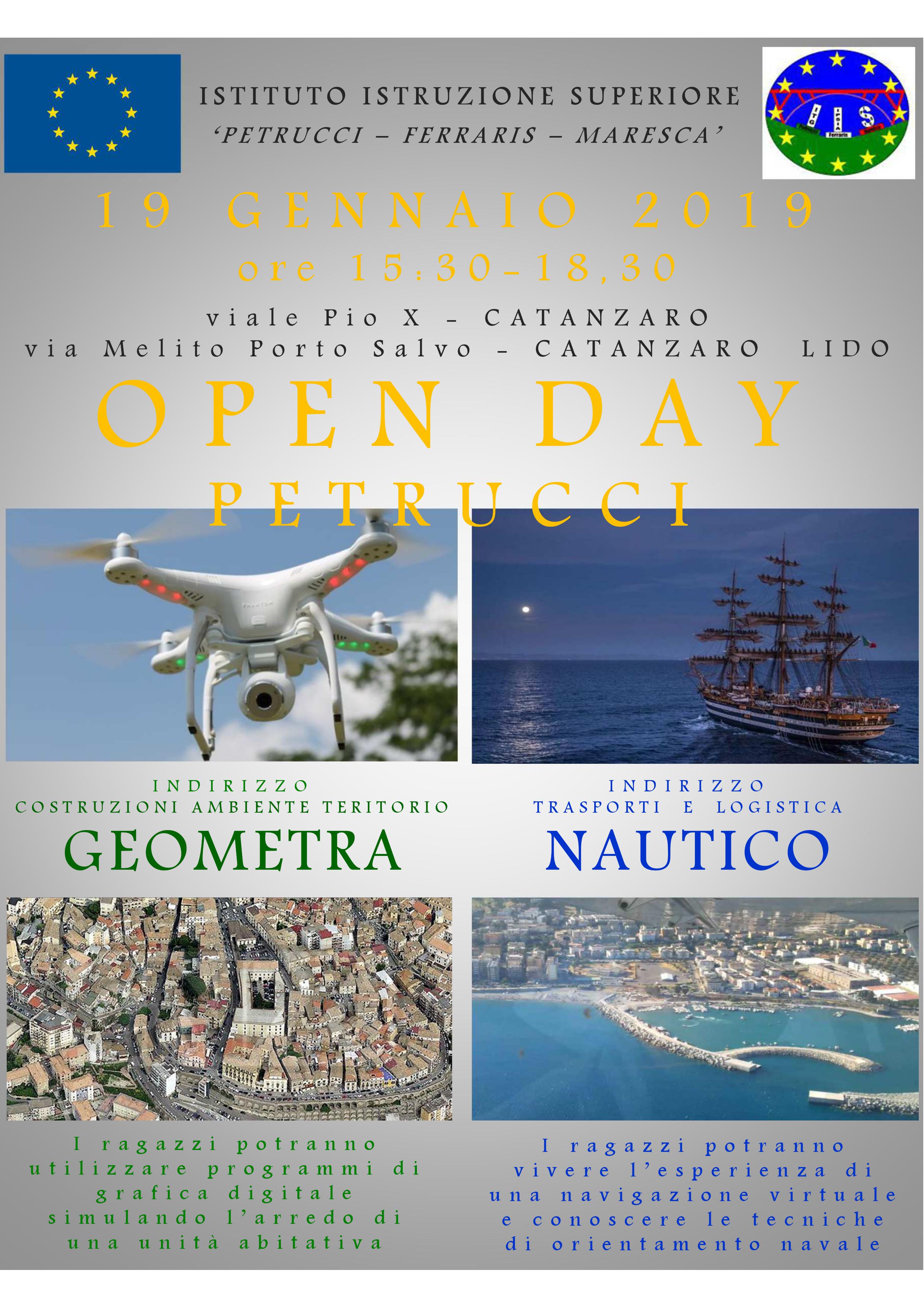 Il 19 gennaio dalle 15.30 alle 18.30 il Petrucci presenta al pubblico gli indirizzi di "costruzione ambiente e territorio", il c.d. "Geometra", e "trasporti e logistica", c.d. indirizzo "Nautico".