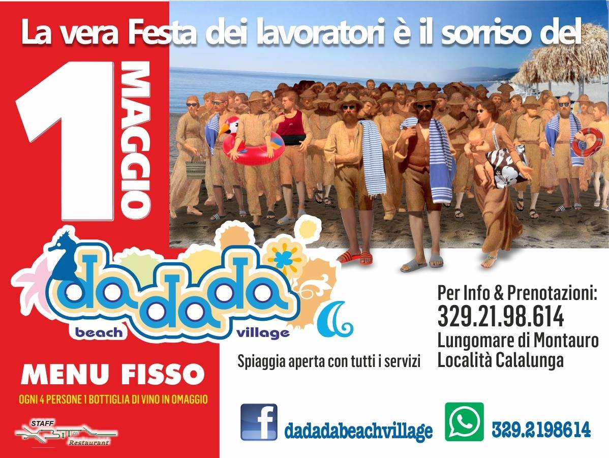 L’idea creativa è, infatti, del Dadada Beach Village: per festeggiare il primo maggio, il rinomato stabilimento sulla Costa dei Saraceni invita tutti i lavoratori con un manifesto artistico accattivante ad imboccare la via del sorriso e trascorrere una giornata di relax a mare, con tutti i confort. Lo staff del Bit Restaurant, quest’anno alle redini della ristorazione al Dadada, propone uno squisito menu a base di pesce fresco accompagnato da una bottiglia di vino omaggio ogni 4 persone. La spiaggia, già attrezzata per la stagione, consente l’accesso ad ombrelloni, sdraio, lettini, docce e attrezzature sportive, dalle canoe alle piccole imbarcazioni. E allora, senza pensarci troppo, incamminiamoci coi lavoratori del Pellizza verso la ridente spiaggia montaurese, perché è proprio vero: “La vera festa dei lavoratori è il sorriso del Dadada”!