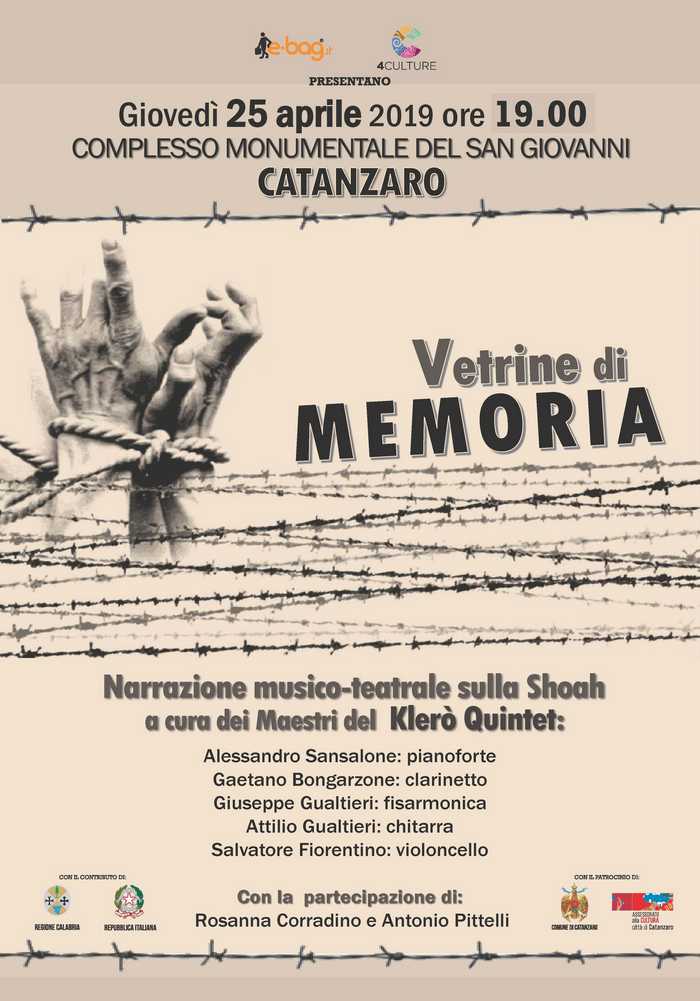 Giovedì 25 aprile, in coincidenza con la Festa della Liberazione, la mostra “Solo per colpa di essere nati” chiuderà i battenti al Complesso San Giovanni con uno spettacolo musico-teatrale sulla Shoah. Dopo aver riscosso grande interesse e partecipazione da parte di scuole e visitatori da tutta la Calabria e non solo, l’evento espositivo promosso dalla 4culture Srls e da E-bag Srl, nell’ultima giornata di apertura al pubblico, ospiterà l’associazione “Compagnia dei Sognattori” che, in collaborazione con il gruppo musicale Klerò Quintet, presenterà “Vetrine di memoria” alle ore 19 nel Chiostro del San Giovanni. L’iniziativa è organizzata con il contributo della Regione Calabria e il patrocinio del Comune di Catanzaro - Assessorato alla Cultura.