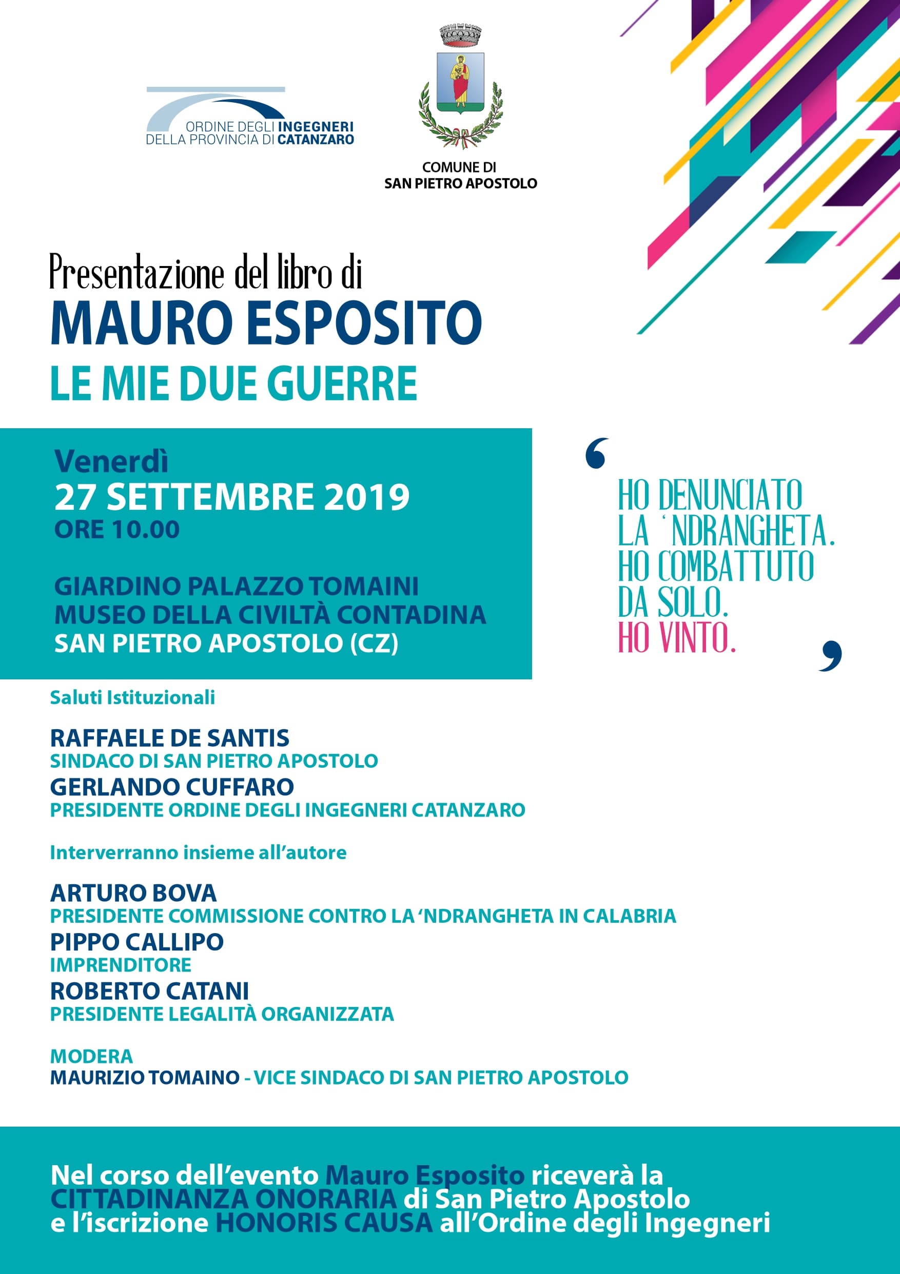 Si terrà venerdì 27 settembre, alle ore 10, nel Giardino di Palazzo Tomaini presso il Museo della Civiltà Contadina di San Pietro Apostolo (CZ), la presentazione del libro “Le mie due guerre” di Mauro Esposito, imprenditore e testimone di giustizia nel processo “San Michele” che ha rivelato l’infiltrazione ‘ndranghetistica nella Valle di Susa. L’evento è organizzato dall’Ordine degli Ingegneri della Provincia di Catanzaro e dal Comune di San Pietro Apostolo.