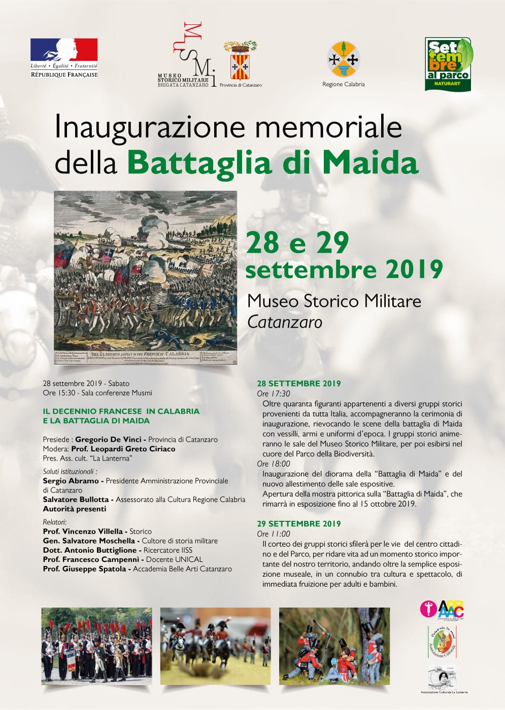 Per celebrare questo momento, la Provincia di Catanzaro ha organizzato una serie di eventi culturali al fine di animare le sale del Museo e il Parco circostante. Si comincia sabato 28 settembre alle ore 15.30 presso la sala conferenze del Musmi con un convegno su “Il Decennio francese in Calabria e la Battaglia di Maida”, che vedrà la presenza di docenti universitari, storici e studiosi riuniti per discutere di questo particolare momento storico legato al territorio. Alle ore 18, il presidente della Provincia Sergio Abramo inaugurerà il nuovo allestimento del Museo e una mostra pittorica di opere realizzate da artisti locali sul tema dell’evento. Il tutto sarà animato dalla presenza di oltre 50 figuranti (reenactor) appartenenti ad importanti gruppi storici provenienti da tutta Italia che nella mattinata di domenica, a partire dalle 11, animeranno le vie del centro e del parco per la gioia di grandi e bambini, in una rievocazione del periodo storico che renderà omaggio alla memoria degli eventi e alla bellezza naturalistica del Parco.