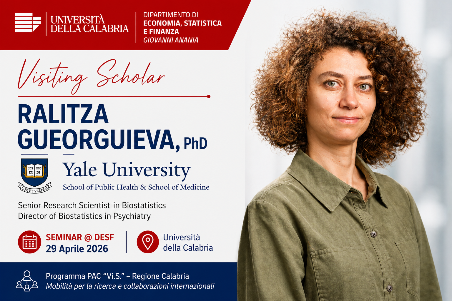 Il Dipartimento di Economia, Statistica e Finanza “Giovanni Anania” dell’Università della Calabria ospita la prof.ssa Ralitza Gueorguieva, Senior Research Scientist in Biostatistics presso la Yale University School of Public Health e Director of Biostatistics in Psychiatry presso la Yale School of Medicine.