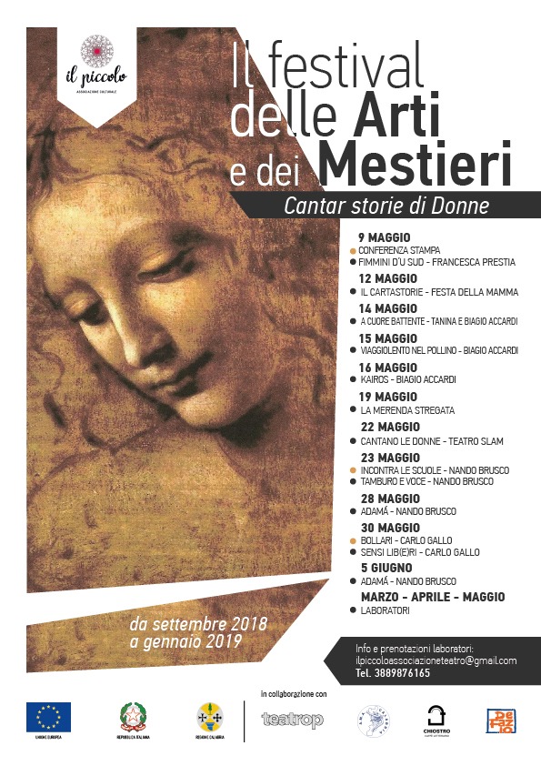 “Il teatro guarda alle antiche maestranze e ai ʻmondi culturaliʼ che ci sono stati tramandati col racconto orale dalle donne. Figure sociali irrinuciabili, che, col loro agire, sono portatrici di messaggi educativi per le future generazioni”. Questo il filo rosso che ha guidato un anno di progetti laboratorialinelle scuole e al Chiostro di San Domenico di Lamezia Terme - da settembre 2018 a maggio 2019 - e un mese di eventi culturali, promossi e realizzati dall'associazione Il Piccolo (affiancata dalla compagnia teatrop e dal laboratorio di innovazione sociale Cantieri di imprese).