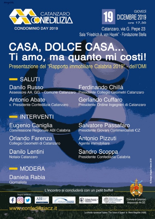 “Casa, dolce casa… Ti amo, ma quanto mi costi!” sarà l’argomento del seminario organizzato da Confedilizia Catanzaro, l’articolazione territoriale dell’organizzazione rappresentativa della proprietà immobiliare, che si svolgerà il 19 dicembre 2019, con inizio alle ore 17,30, presso la sala “Friedrich A. von Hayek” dello storico complesso della Fondazione Stella di Catanzaro, in via G. Pepe n. 23.